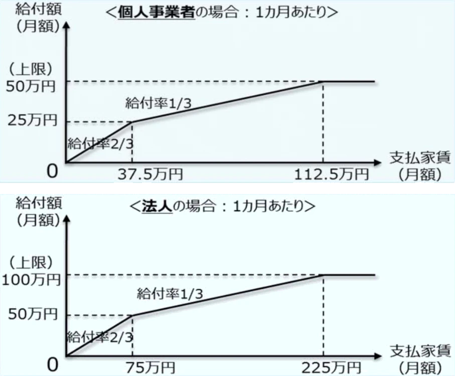 個人事業主は25万円、中小企業は月に50万円を上限に、賃料の3分の2が半年間給付されます。加えて、複数店舗を所有する場合など、家賃の総支払い額が高い事業者を考慮して、上限を超える場合の例外措置が設けられます。その場合、支払家賃(月額)のうち給付上限超過額の1/3が給付され、給付上限額(月額)は個人事業者50万円、法人100万円に引き上げられます。事業内容に飲食の制限はないので、営業所や事務所の家賃負担がある建設業でも、売上減少が認められれば対象となります。