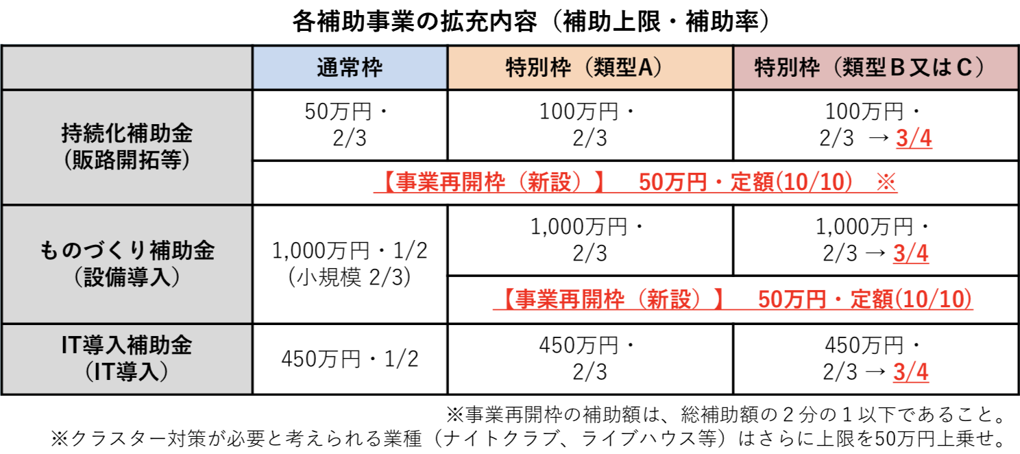 持続化補助金(持続化給付金とは別の制度です)と、ものづくり補助金について、感染防止対策の取組に関する定額補助・補助上限50万円の別枠(事業再開枠) が上乗せされます。