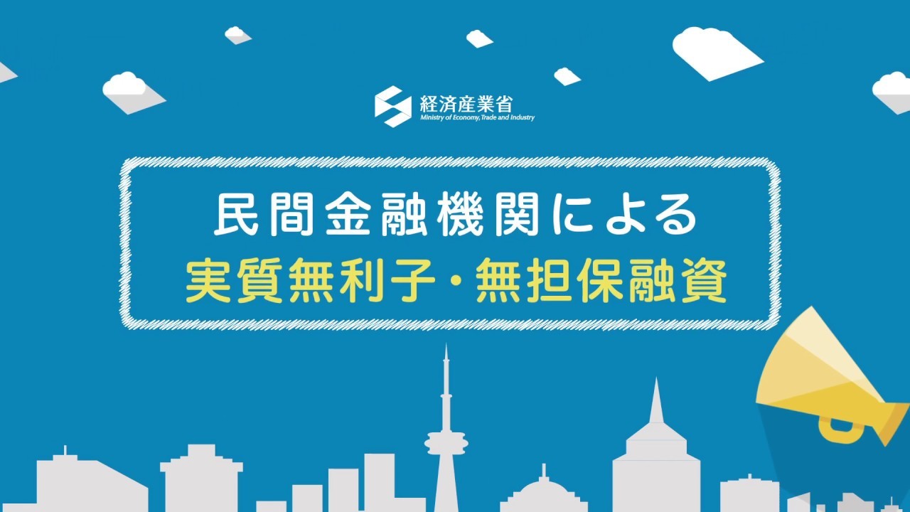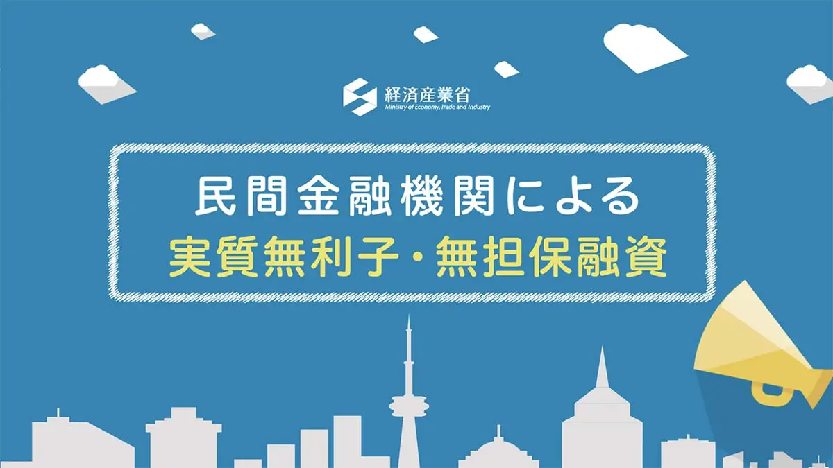 経済産業省が制作した、民間金融機関による実質無利子・無担保融資の解説ビデオ。(別ウインドウが開きます)