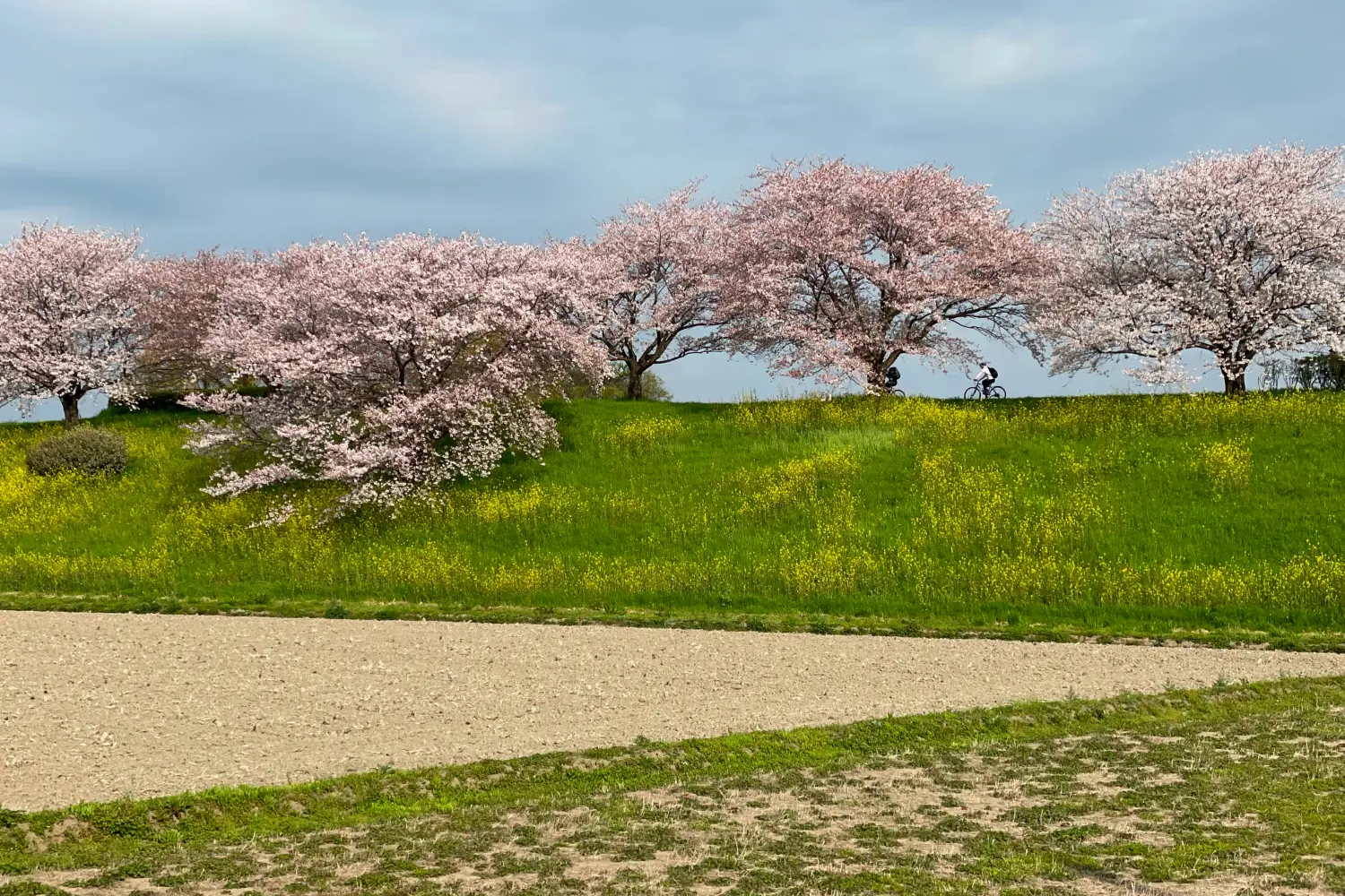 桜が綺麗そうだなと思い、裏の土手まで散歩した時の一コマです。桜と菜の花そして花曇りの空が春の風景そのものと思いました。サイクリングを楽しむ人たちも風景の一つですね。街や付近では人工物を見る機会の方が多く、季節感を感じない日々が続いていただけに、近づいたり離れたり、この風景に似合う建築はこんな感じかななどとしばらくそこで楽しんでいました。