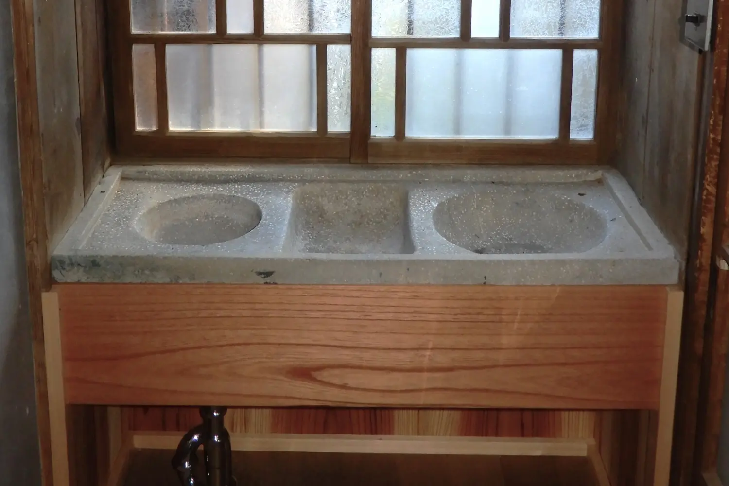 築91年の古民家。物置の片隅に眠っていた研ぎ出しの洗面器。築当時の姿に復元しました。手洗いは吊り下げ式の水タンクを設置する予定です。