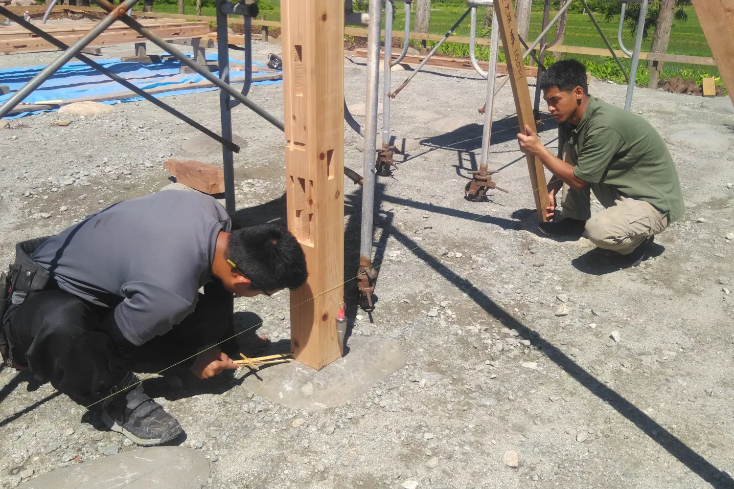 長男と次男、兄弟で初めて一緒に入る現場での一枚。石場建て礎石のヒカリ付け作業風景