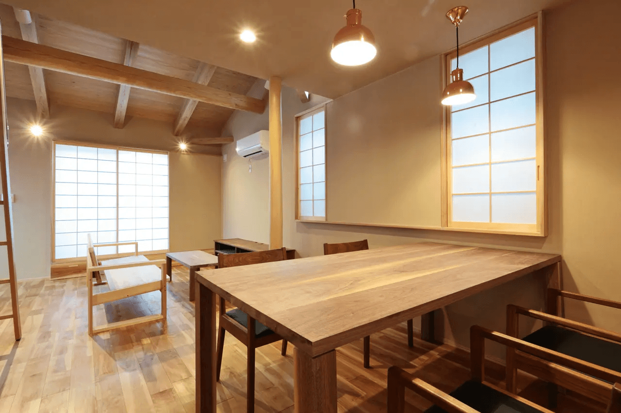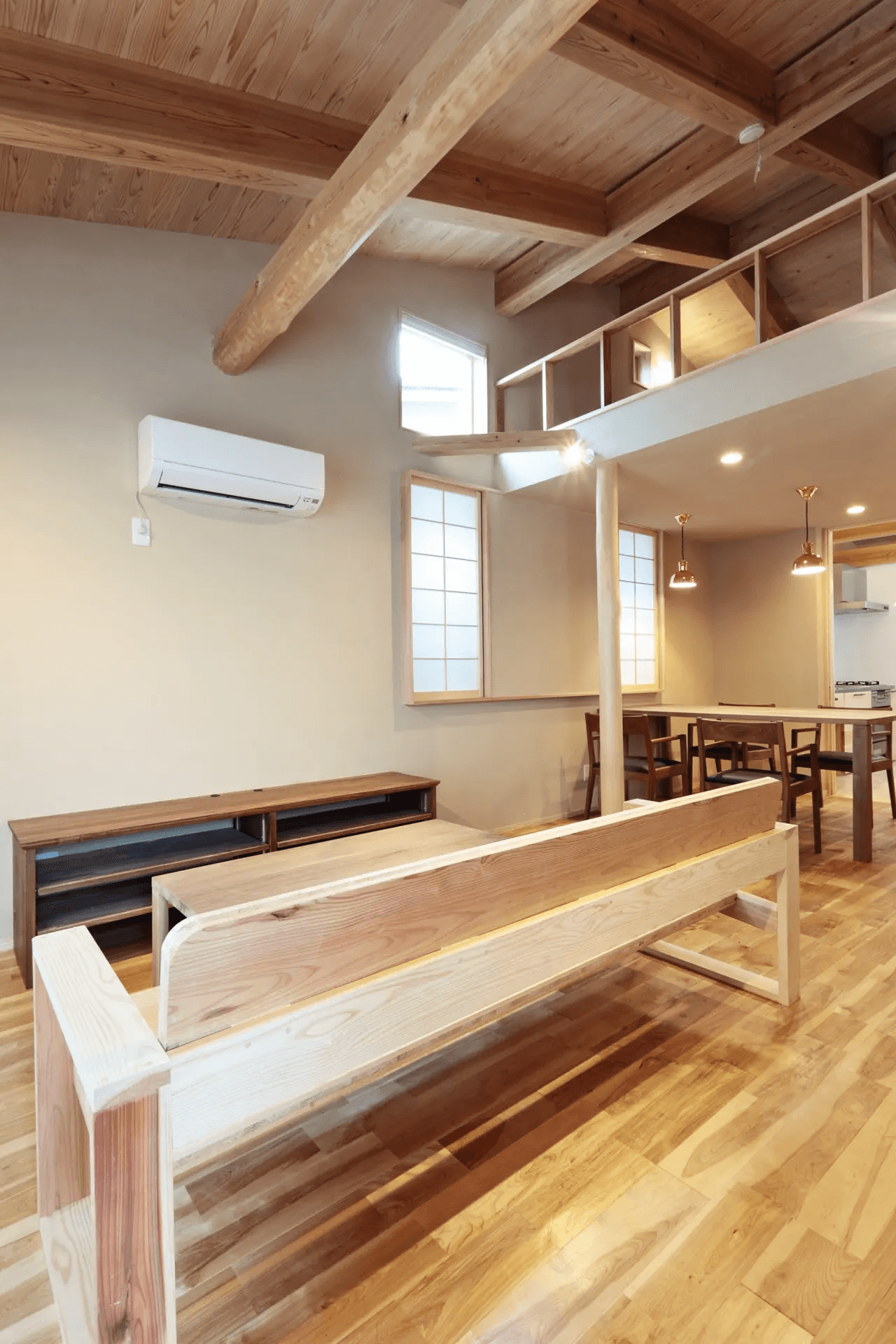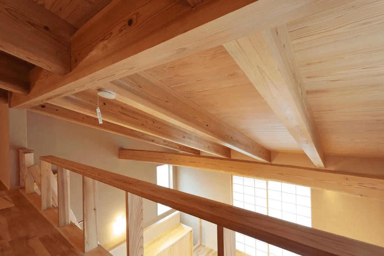 勾配天井を支える国産杉の登り梁は表しとなっているため、より「木組みの家」を感じることができます。