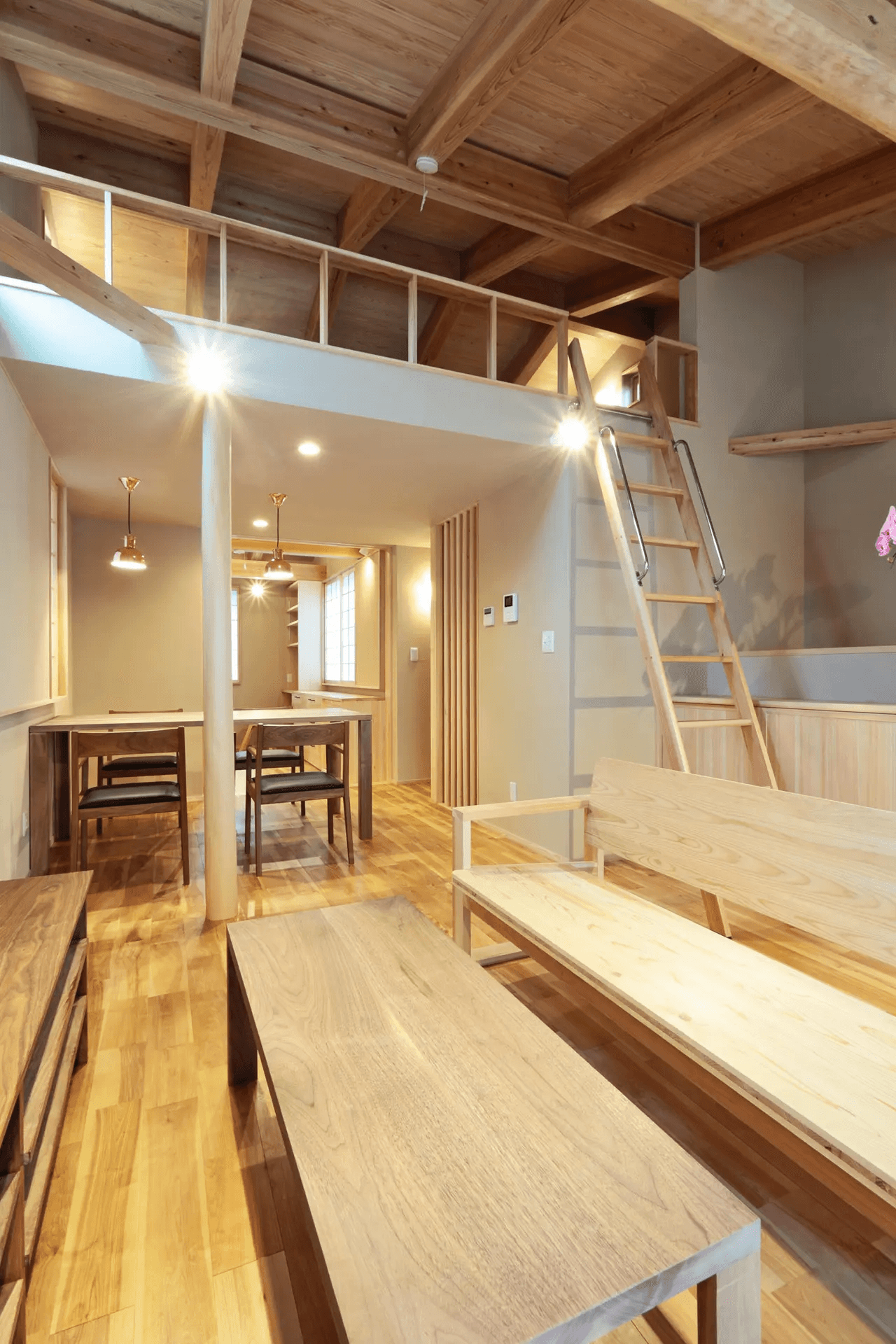 リビングとダイニングの間の磨き丸太が空間のアクセントになっています