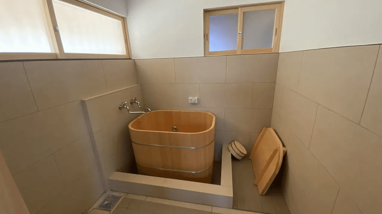 浴室は、FRP防水で地面から離れています 浴槽は、木曽のヒノキで特注