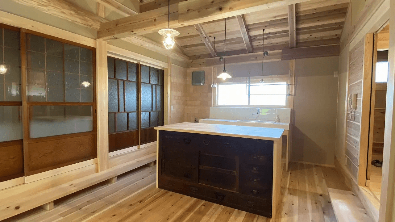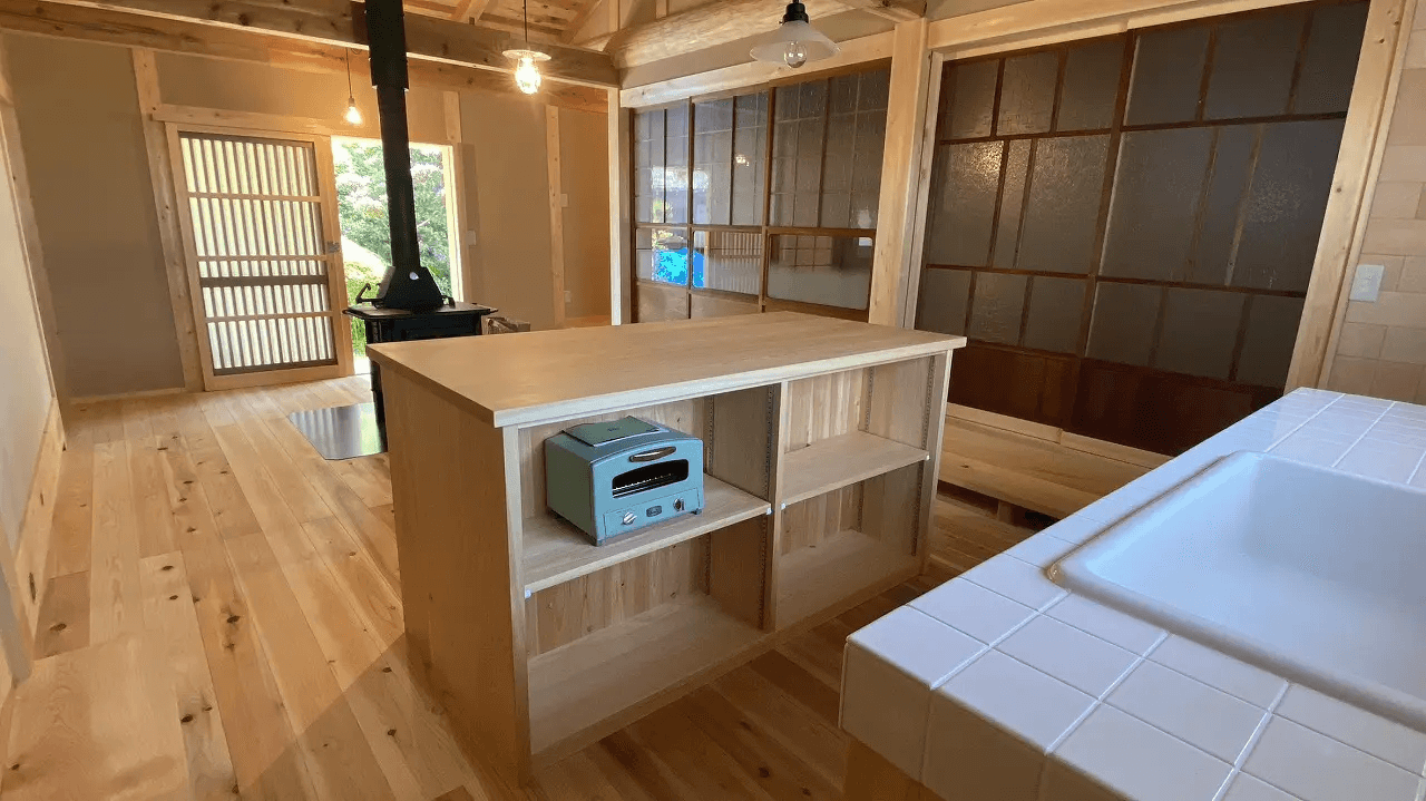 台所カウンターの下に古い食器棚を設置 建具もリユースです