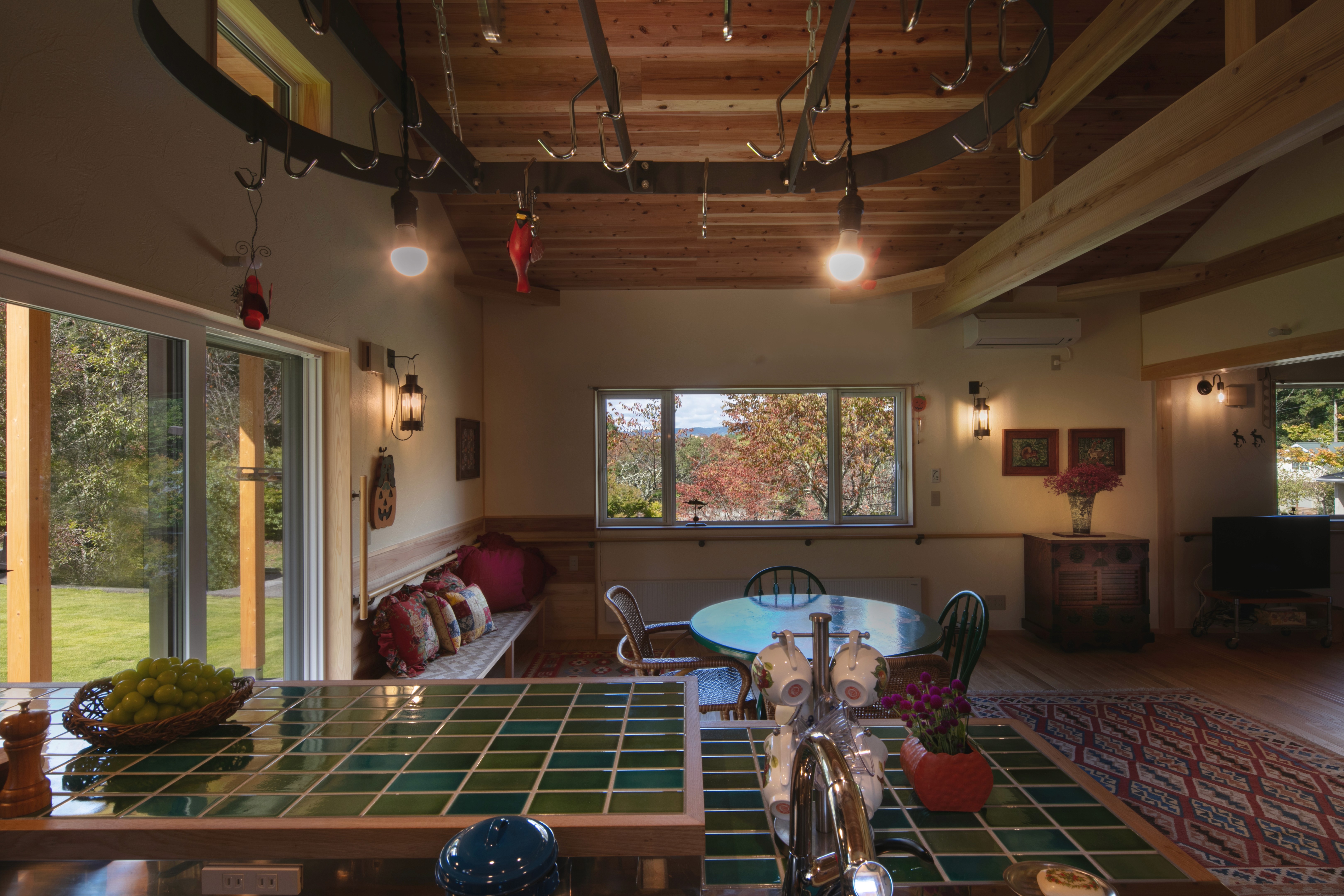 【LDK】カウンターの多治見タイルは特注の緑色を基調で配色。窓からは遠景の山々を望むことができ、隣の池の水面も見え、春には池の周りの桜の花や秋はドウダンツツジの紅葉が美しい。