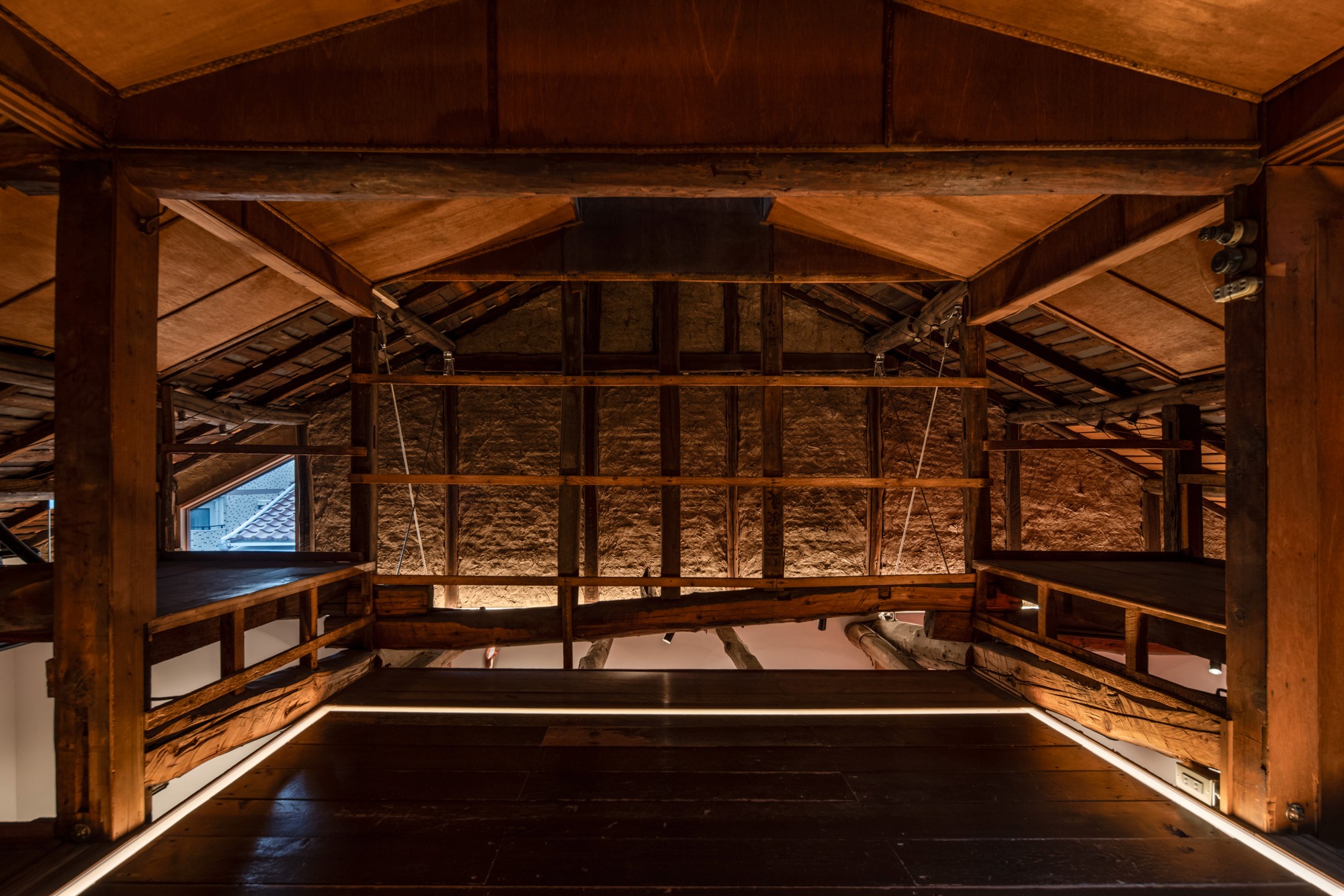 もともとあった二階の化粧合板を取り払い、一階と二階をつなげ空気の流れを越屋根まで流すように計画。照明で印象のある空間に変化。