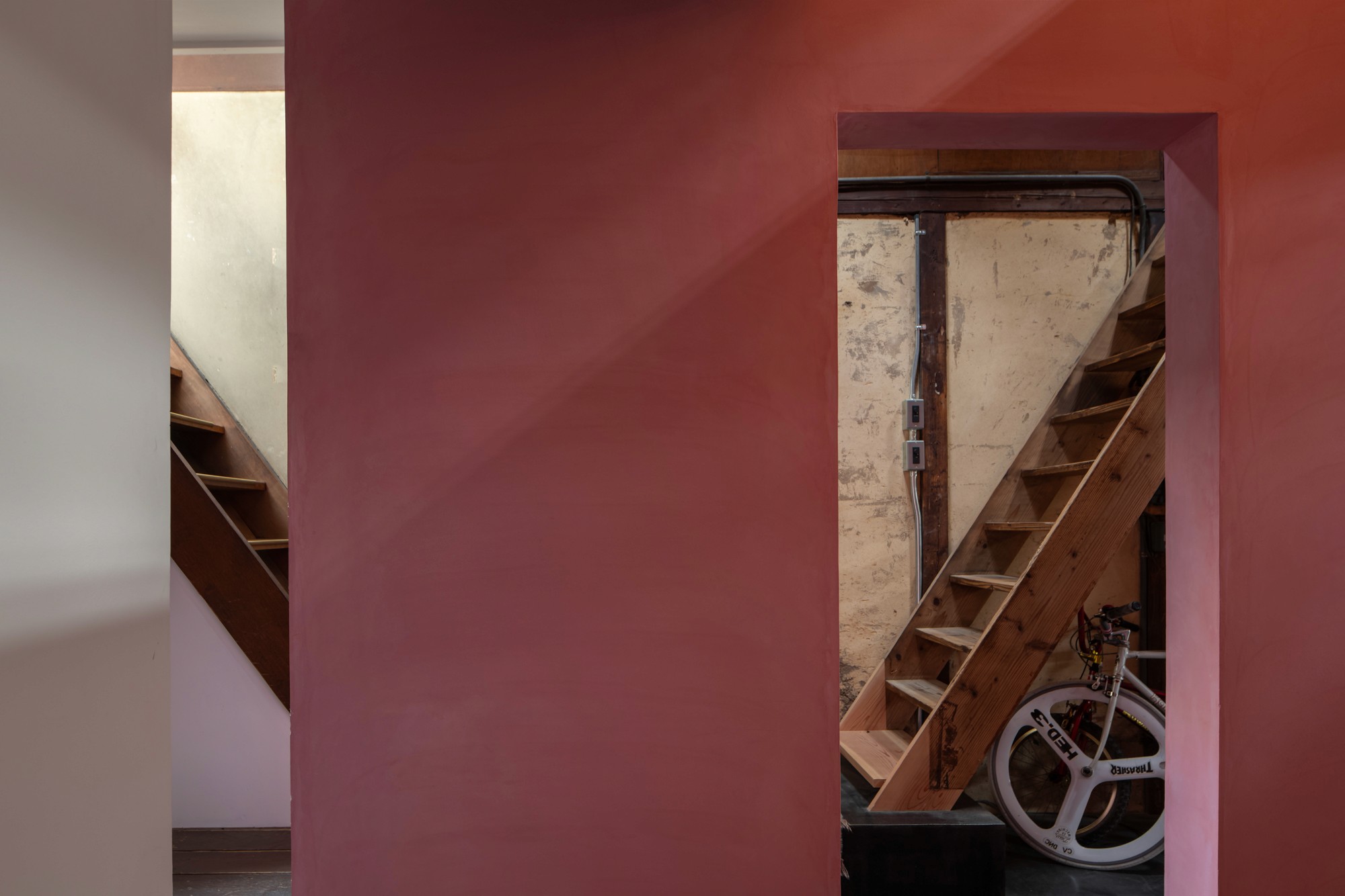 すでに増築を複数回されていて、階段が二つある面白い建築。漆喰に色を付けて発色の良いピンク色に仕上げる。