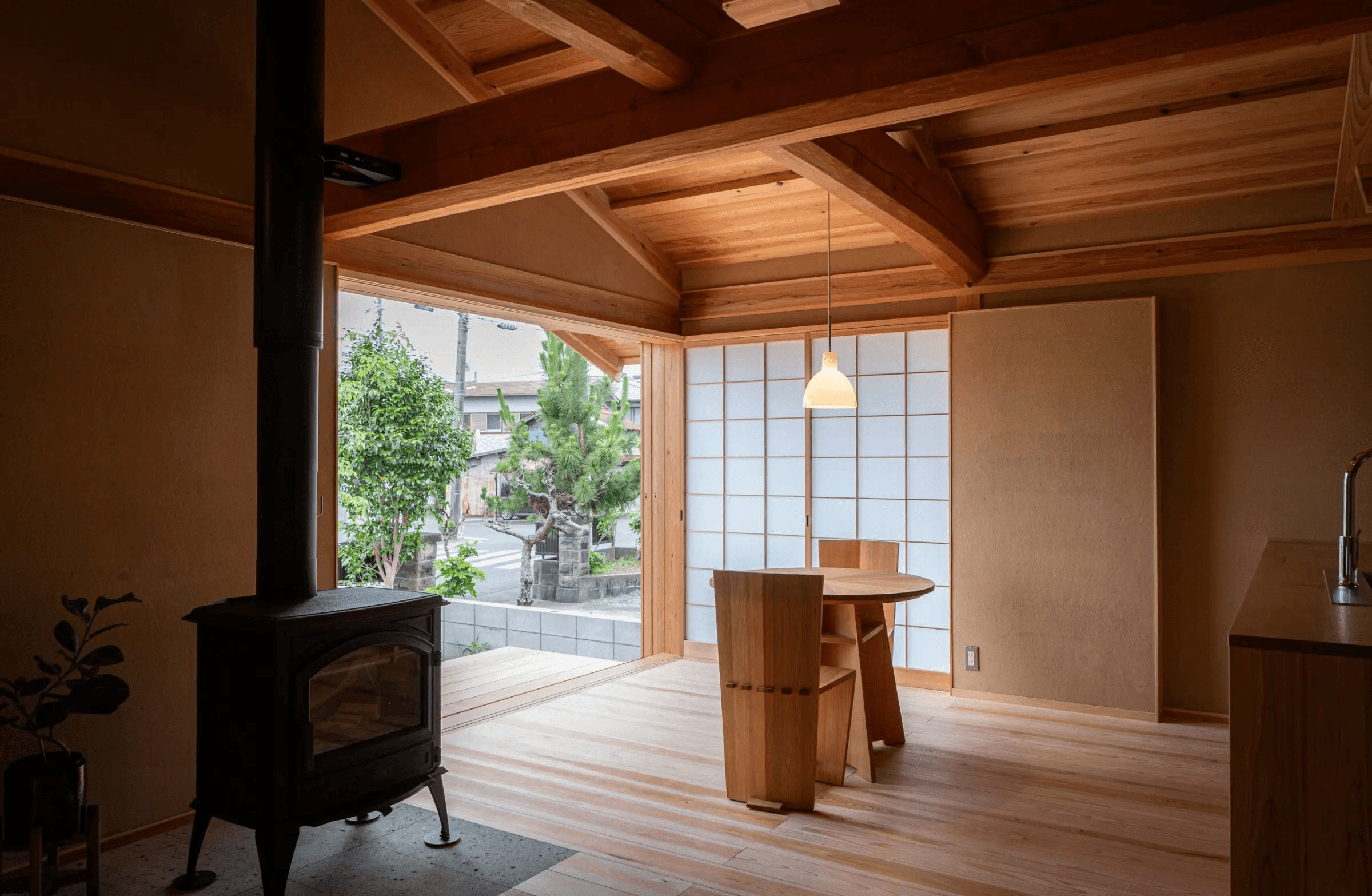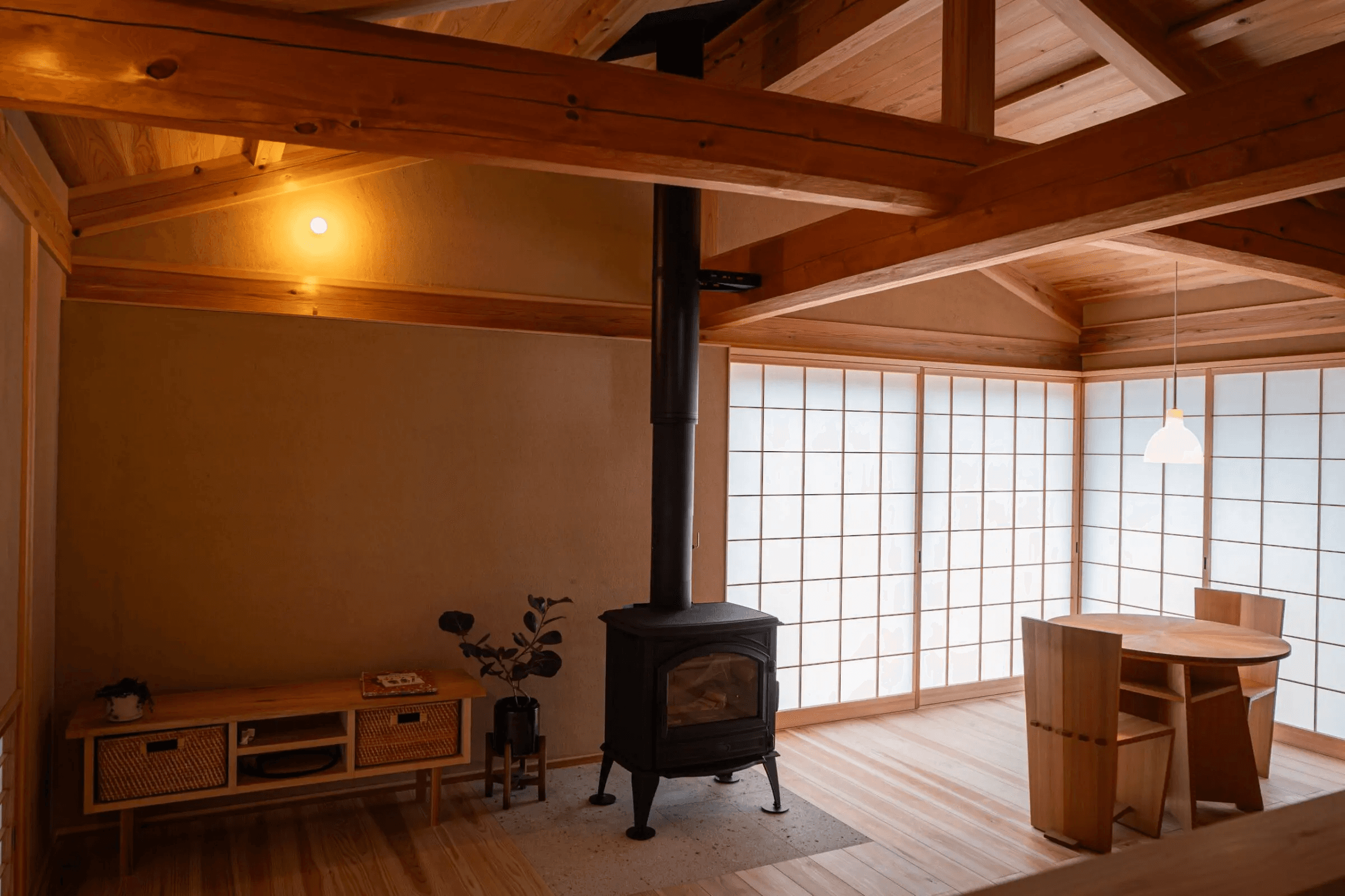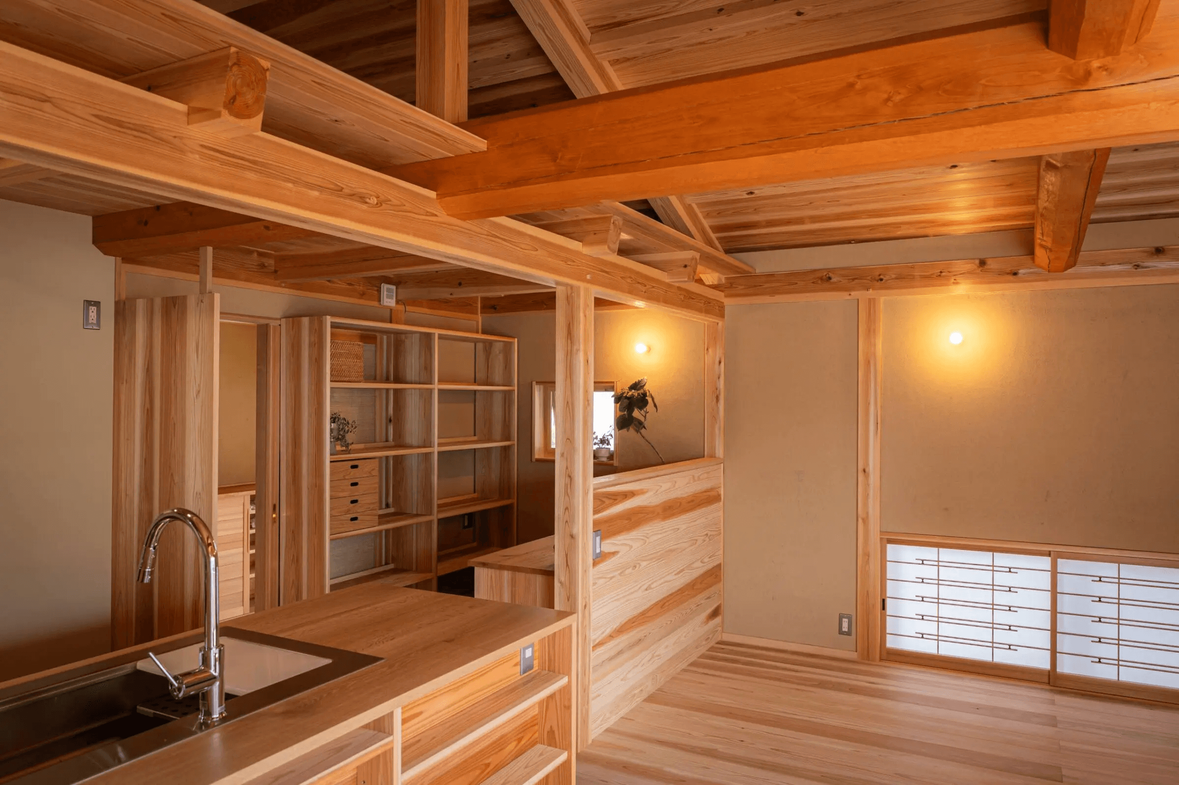 母屋の敷地内に子育て中の家族が暮らすハナレです。地域のもの・日本のものにこだわり、木材は主に天竜産の杉やヒノキ、家具には森町の椎の木を利用しました。住まい手や地域の人達と一緒に竹小舞を編み土を塗った土壁。呼吸する土壁と無垢材が心地よい木と土のハナレです。