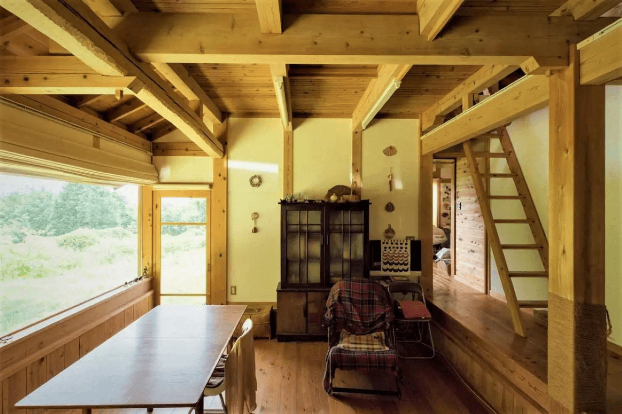 大きなピクチャーウィンドウの両端に開閉できる通風窓をつけた 右手の階段からロフトに上がる