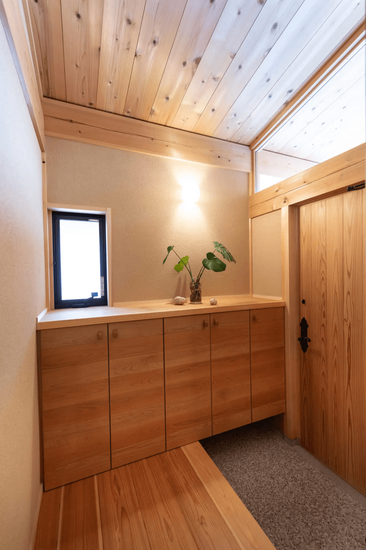ランマ越しに優しい光が入る玄関です。下駄箱の扉はヤマザクラの無垢板を貼りました。