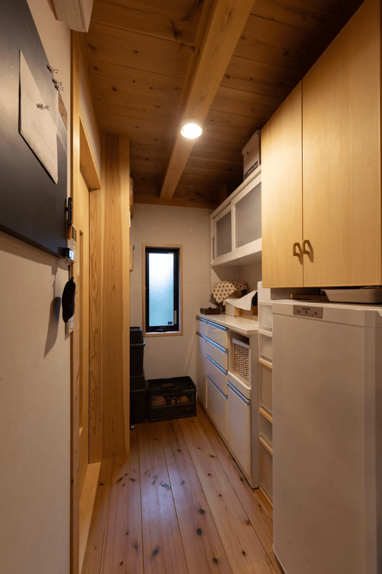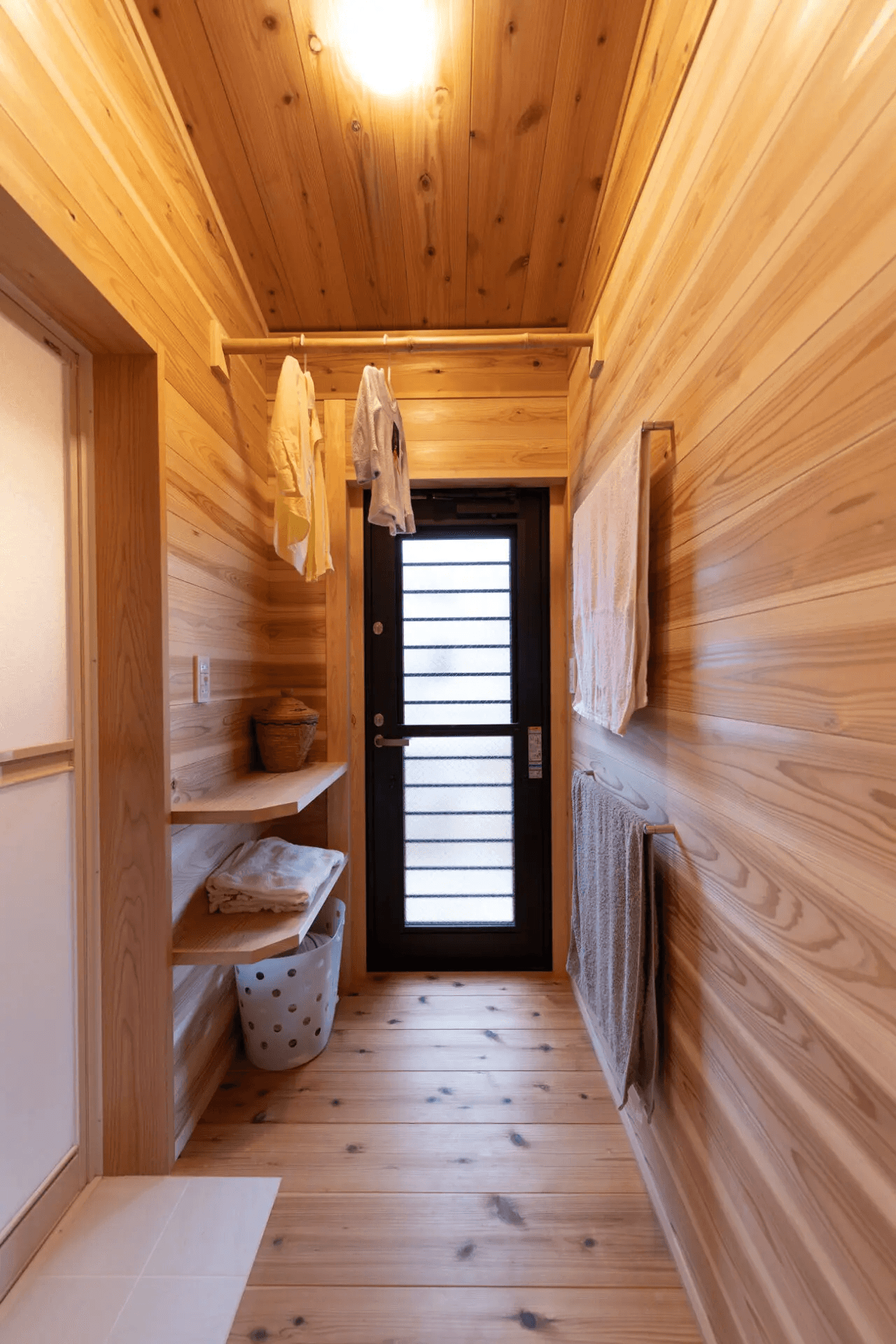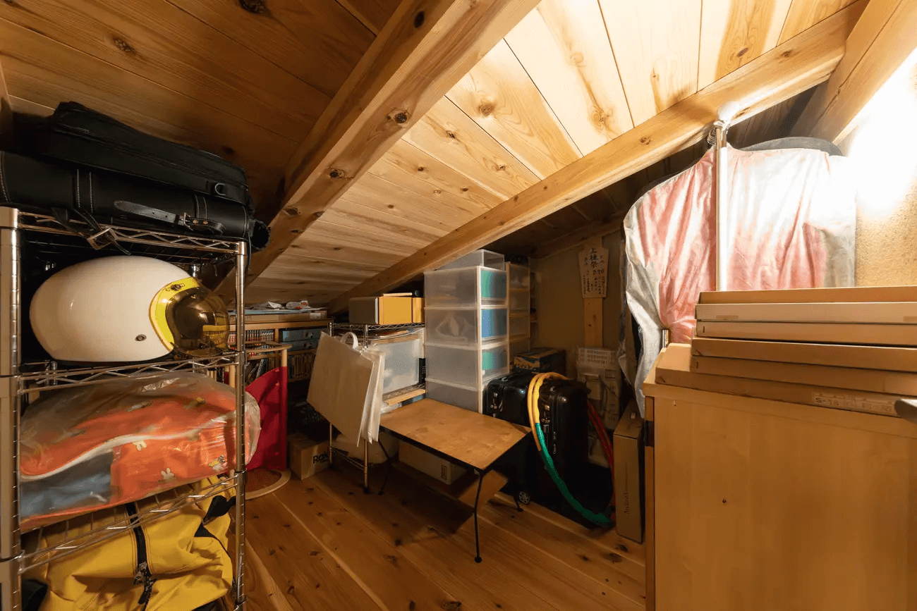 杉の赤身板を使った造付け外物置。収納の中は棚板の高さが調整できるようになっています。