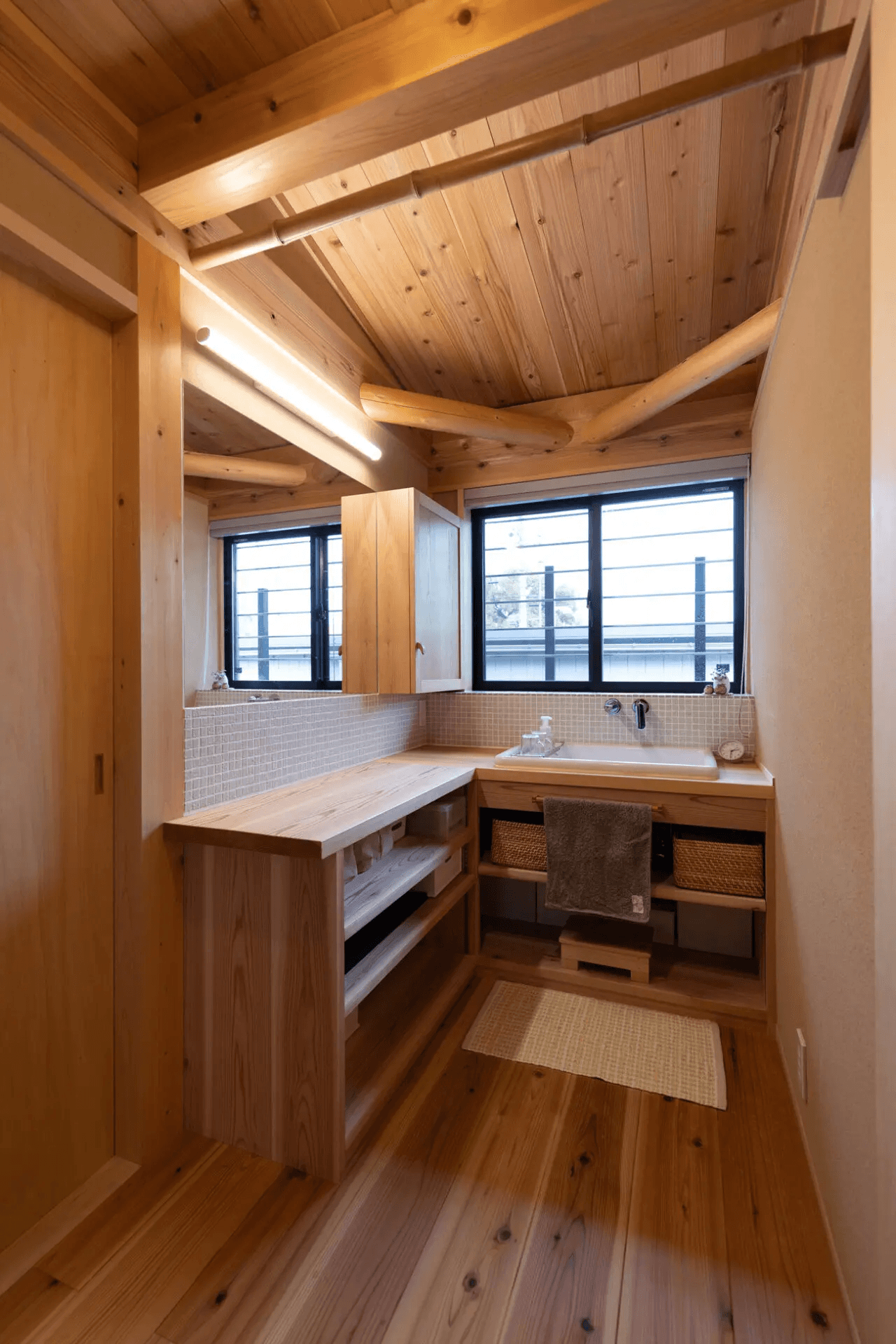 実験流しシンクを利用したL字型の洗面台。アイロン掛けなどもできるようにしました。