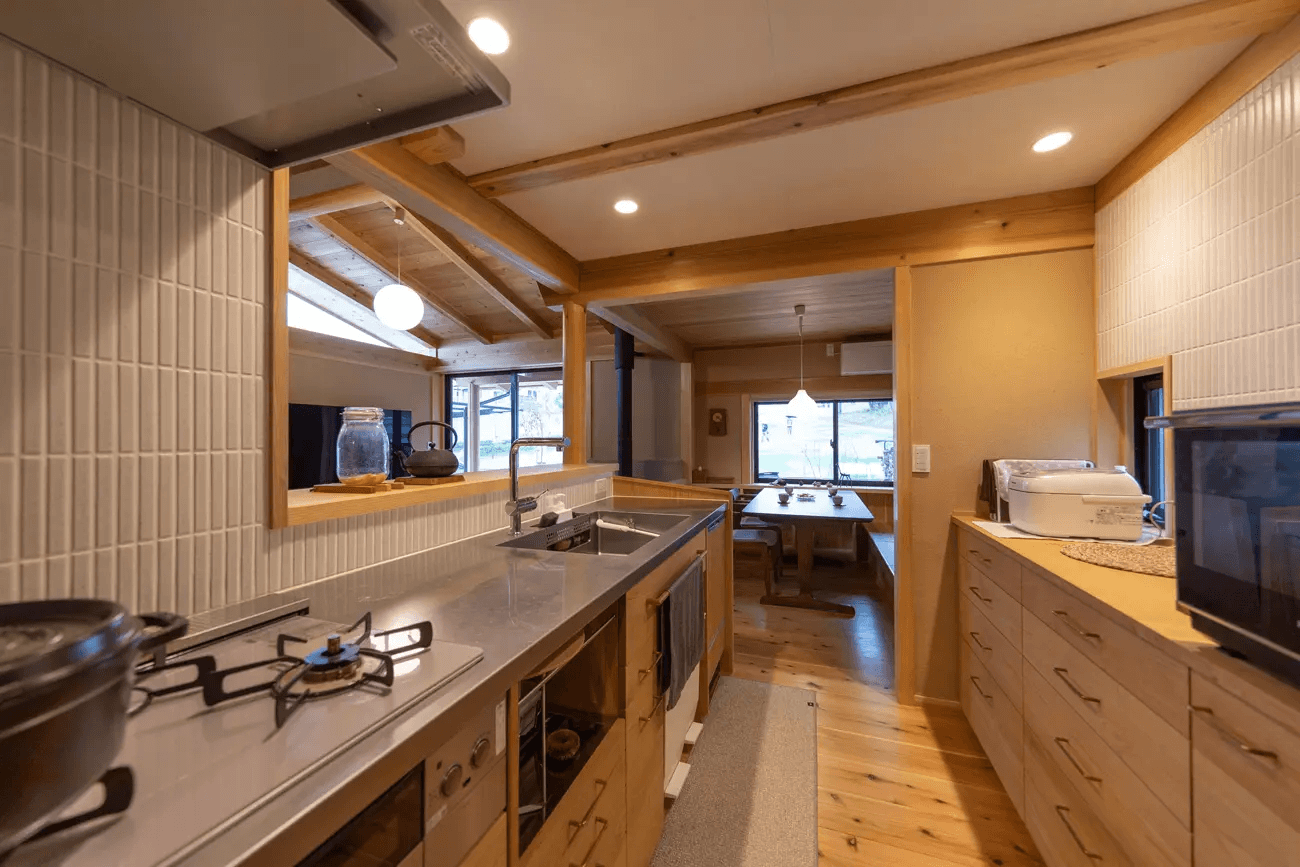 住まい手のご要望が詰まった、栗の木でつくったオリジナルキッチン。日常の配膳などを考慮してダイニングと直列導線にしました。