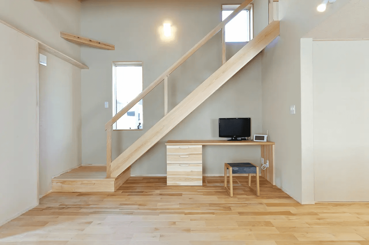 階段下を有効活用してワークデスクを設けました ワークデスクも大工の手造りでカウンターには桧を使用