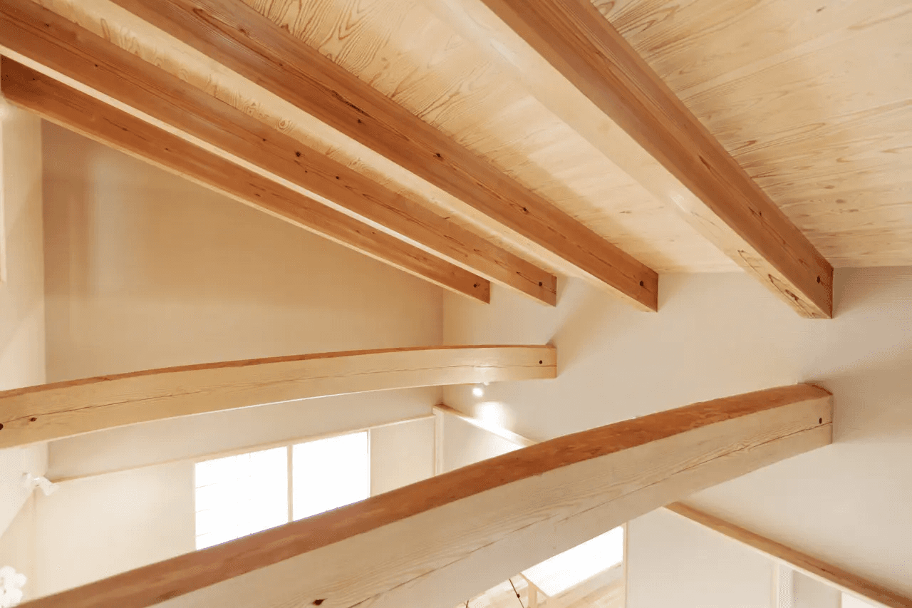 登り梁に杉の野地板をのせて、そのまま化粧として表しています