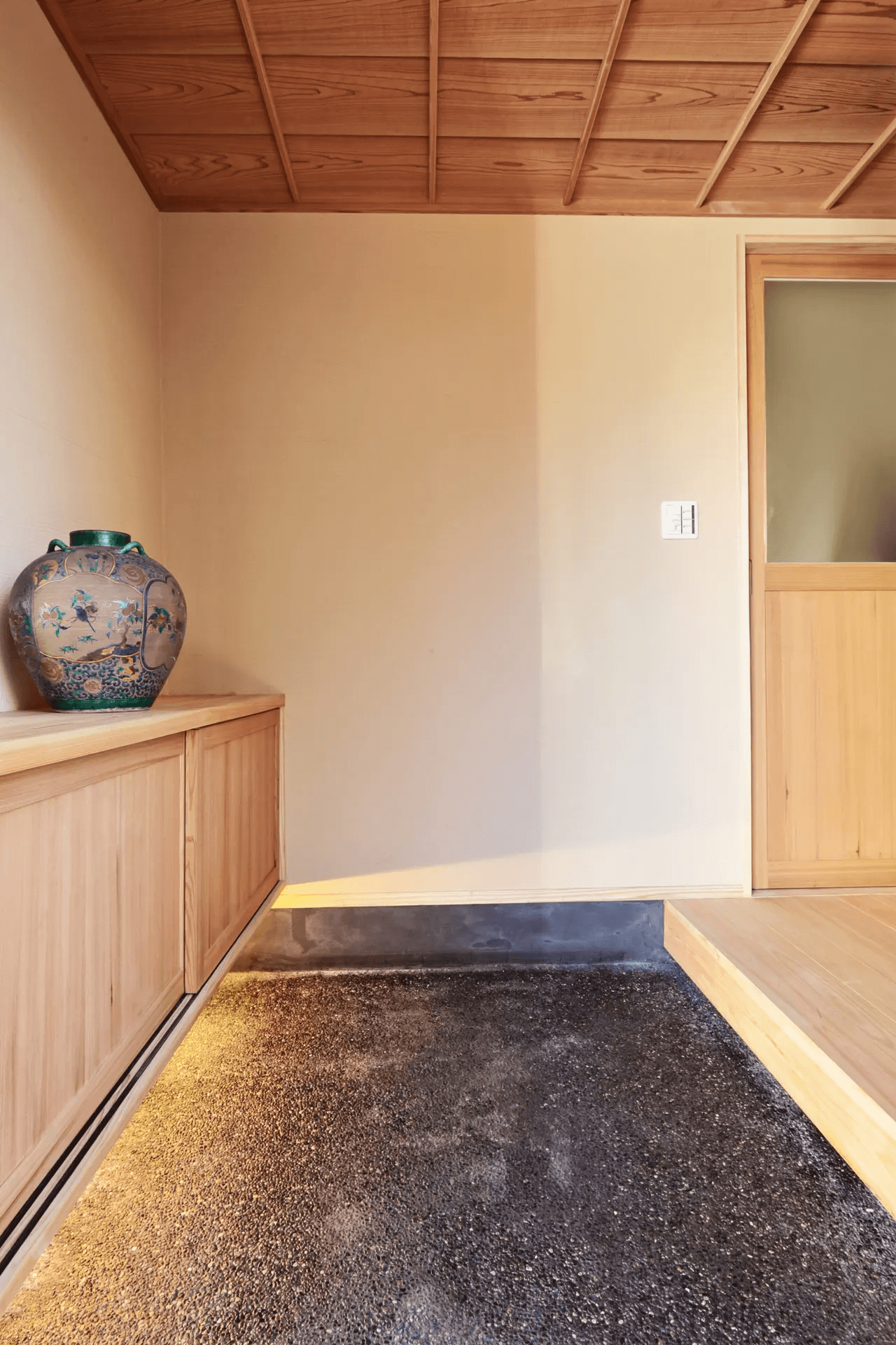 和の雰囲気漂う玄関 玄関框には桧を使用して、玄関土間はモルタルの洗い出しで仕上げています