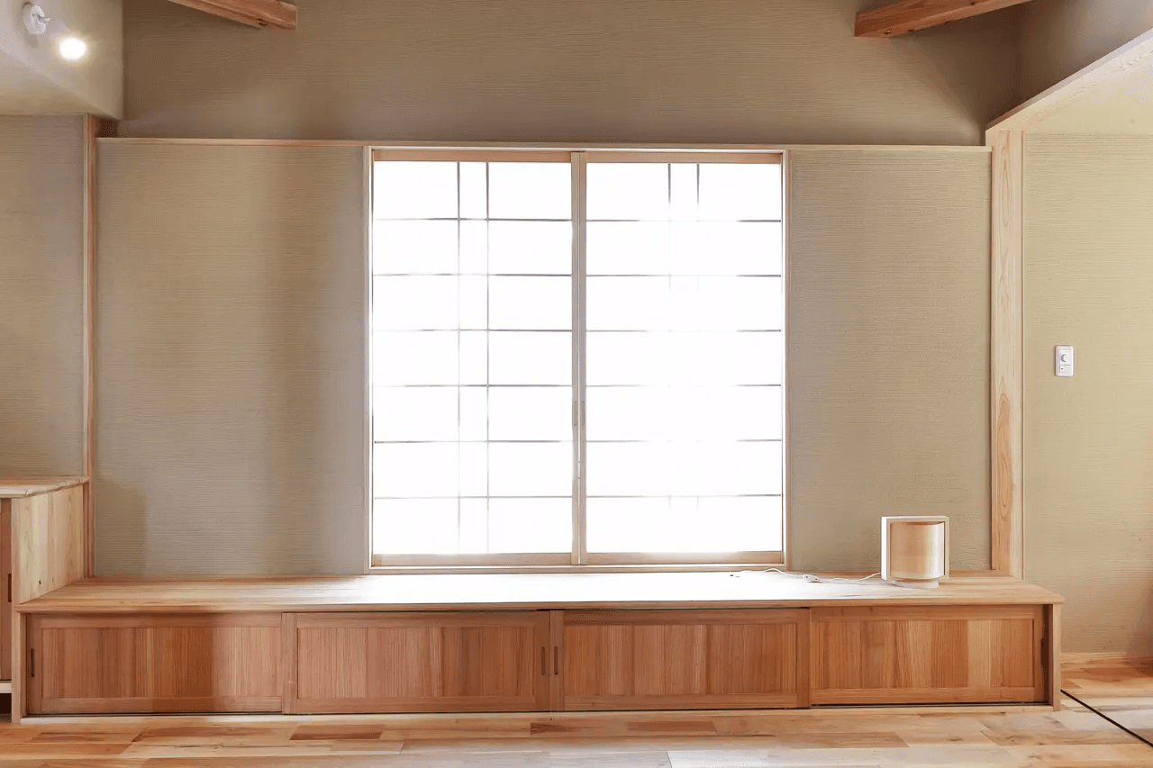 大工が造った造り付けの家具 窓はすべて引込みの障子にすることで和のテイストも取り入れました