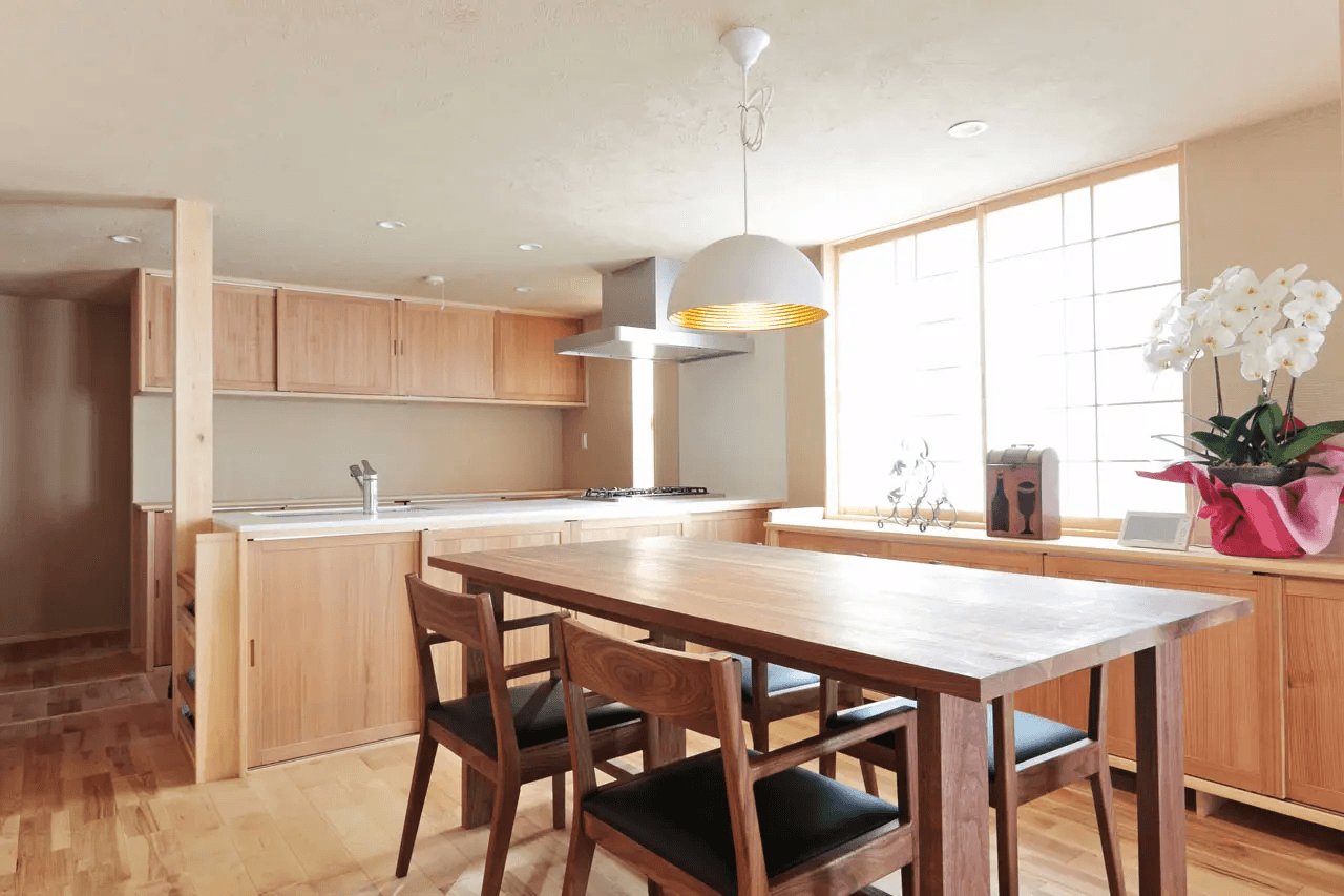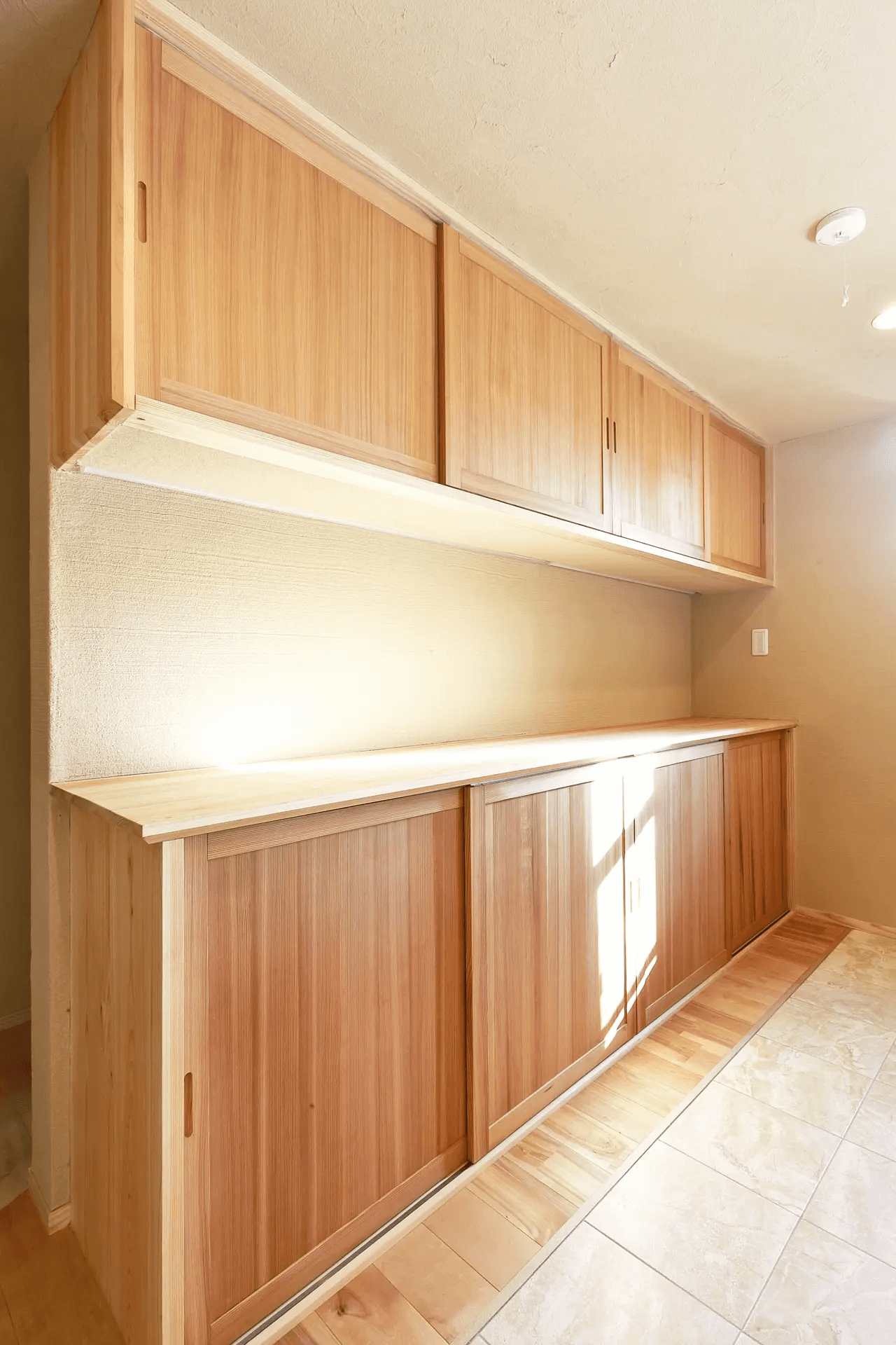 キッチンの背面には造り付けの家具を設置して収納も充実 カウンターには桧を使用してキッチン同様に秋田杉官木の赤柾目の建具を使用