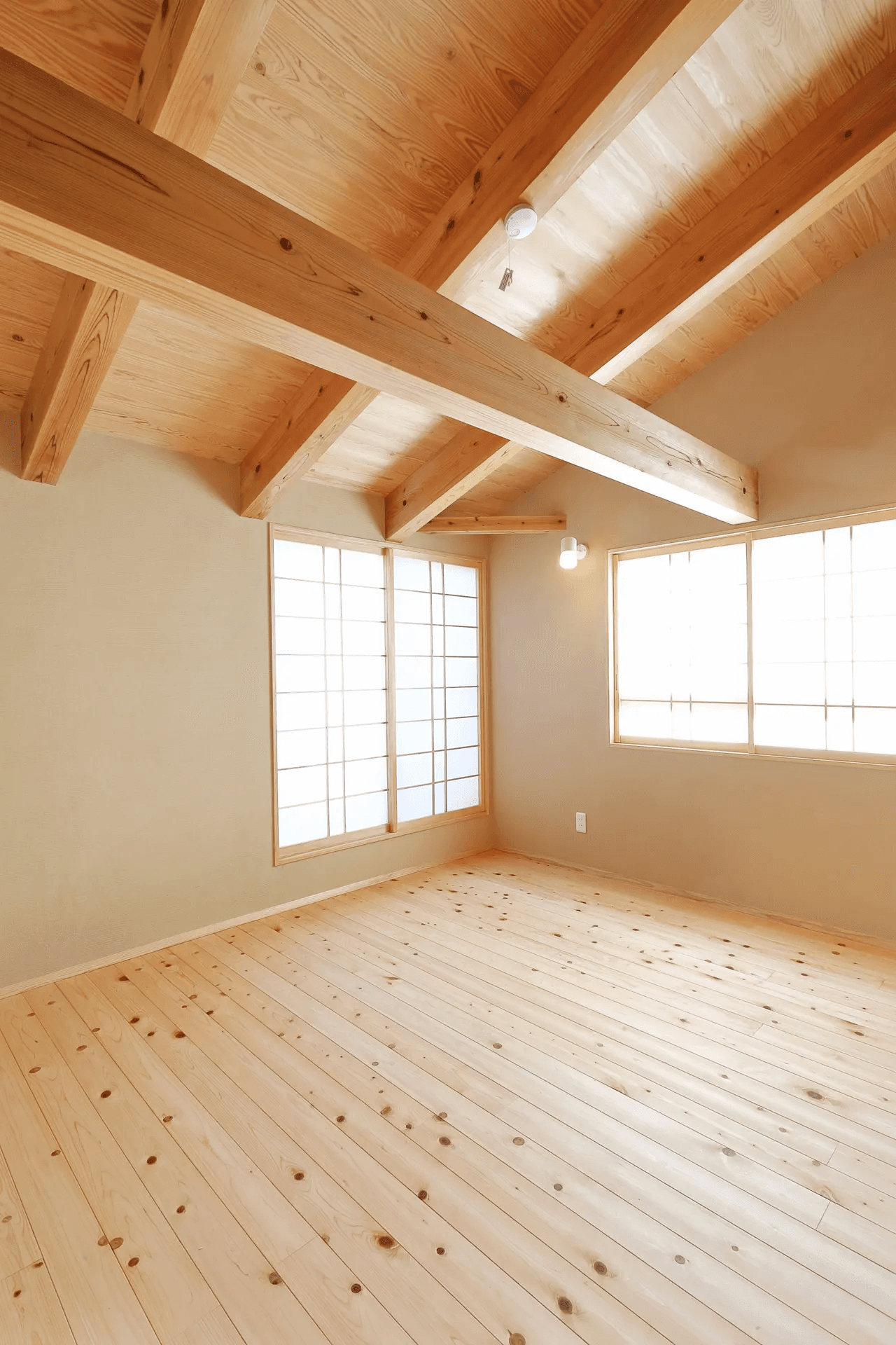 2階の寝室には無垢の桧フローリングを使用して落ち着いた雰囲気に