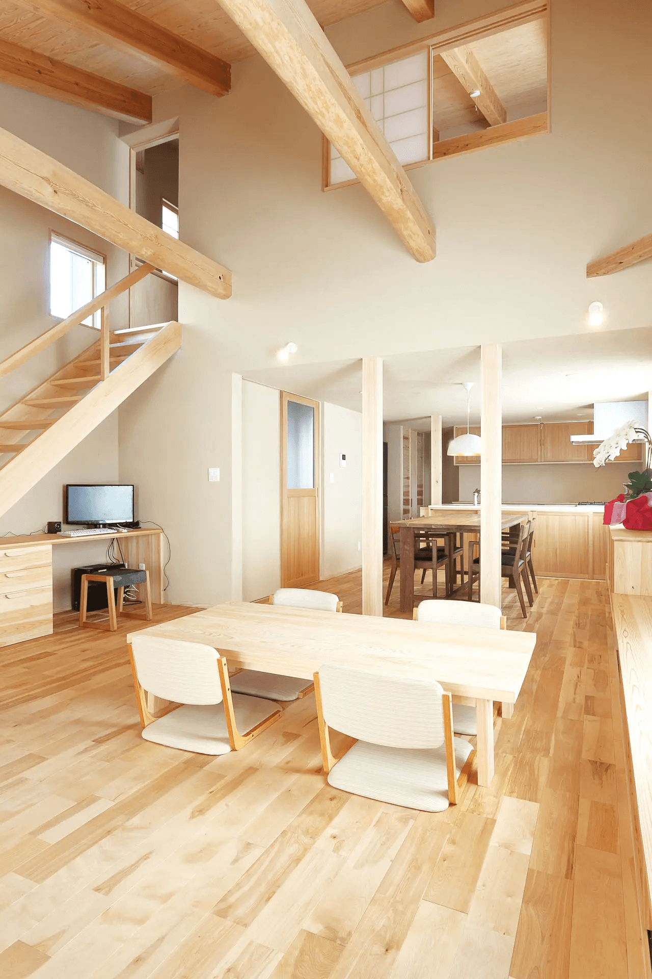 1階にはカバの無垢フローリング、2階には桧の無垢フローリングとあえて違うものを使用。