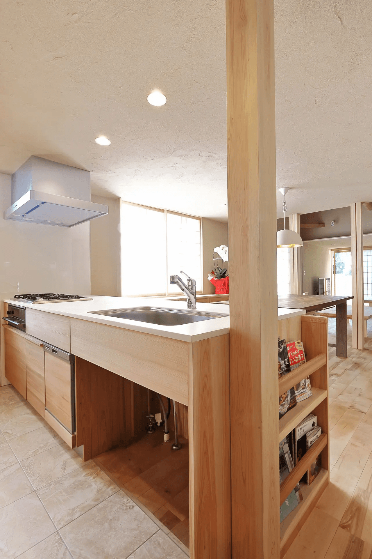 お施主様こだわりの造作キッチン キッチンの面材には秋田杉官木の赤柾目を使用 サイドには造作のマガジンラックを設置