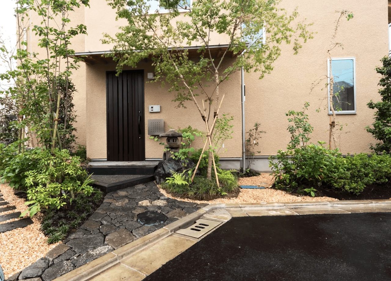 玄関まわりに植栽をすることで落ち着いた和の雰囲気に 外観はそとん壁で仕上げました