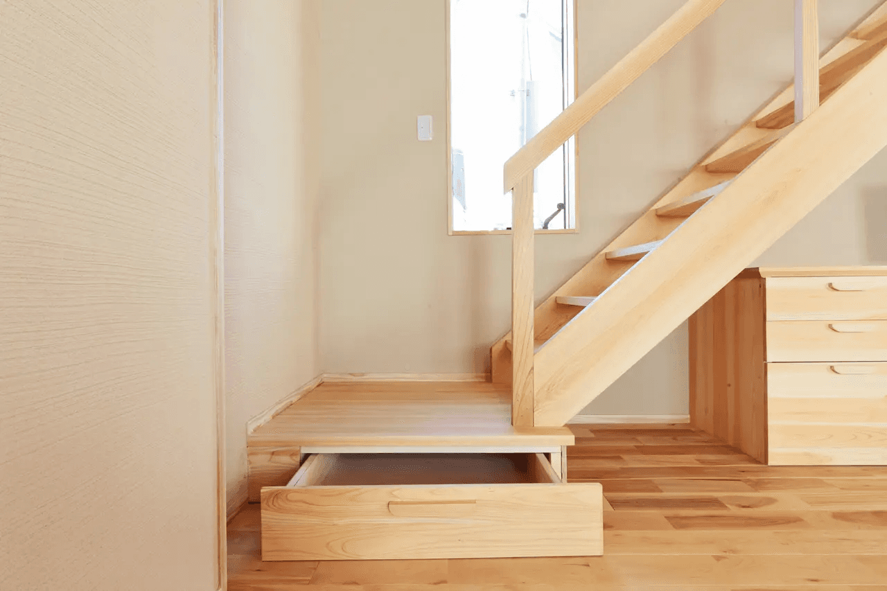 階段のこんな所にも収納スペース 都内の狭小地ならではの工夫です