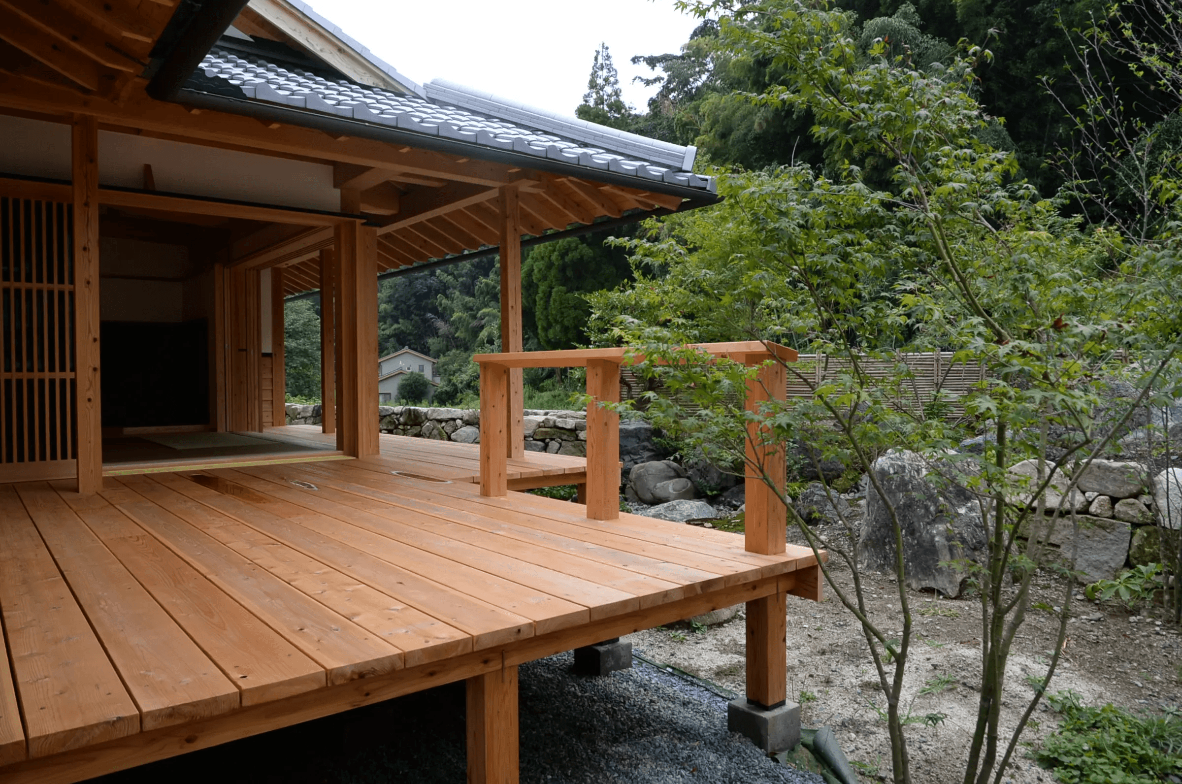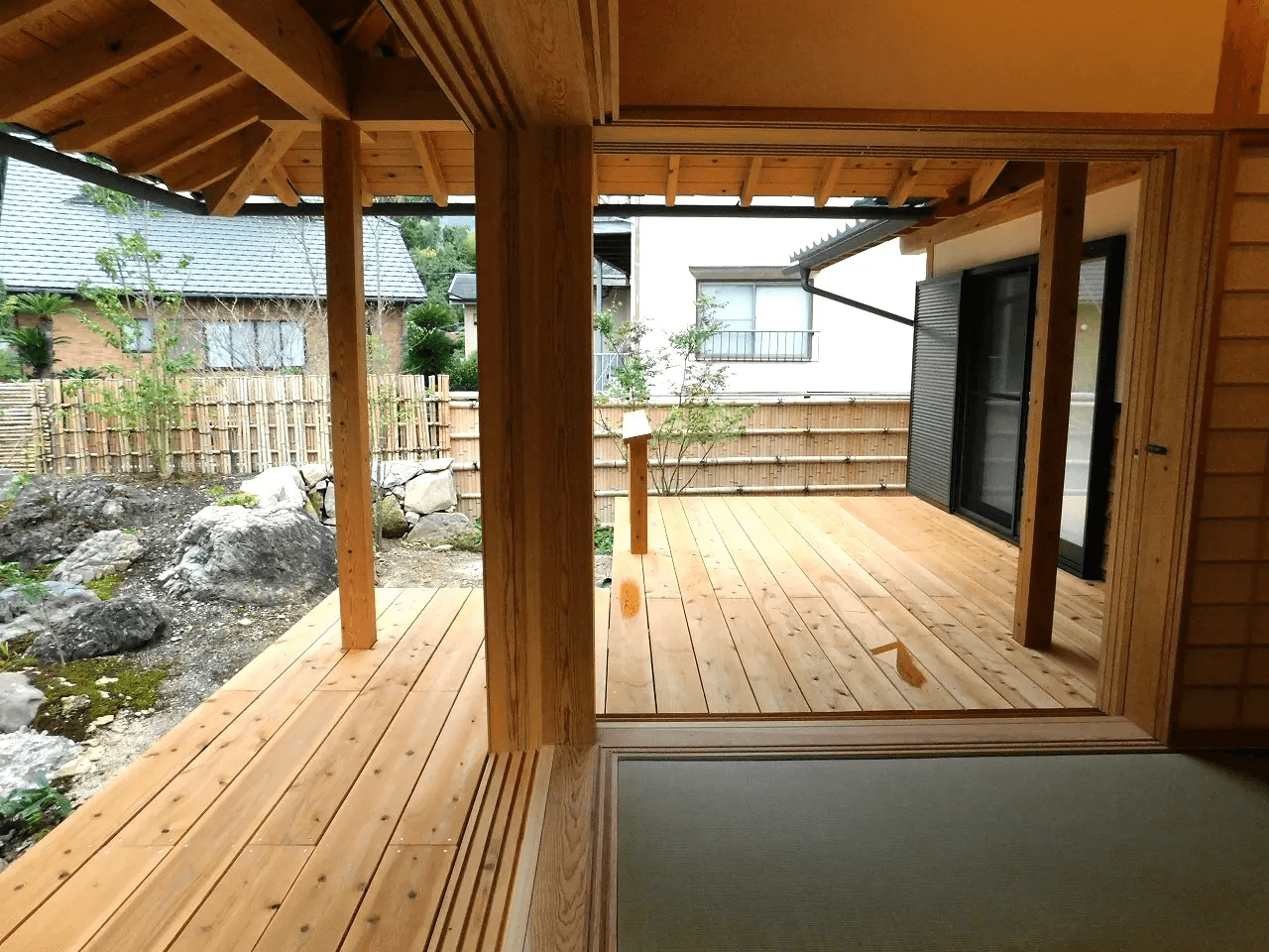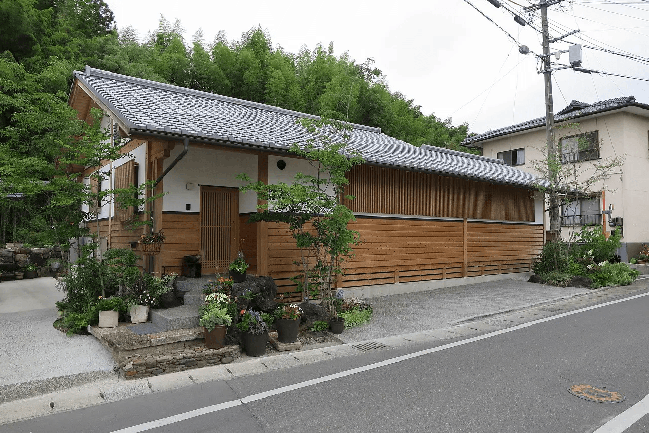 敷地南に小高い丘があり、その下に小川が流れている。緑と小川の水を通した風を大きな開口部から取り入れ北の窓から逃がす。北道路はバス通りとなっているので、厚みのある面格子を設置した。移動中のバスから家の中は覗き込めない。