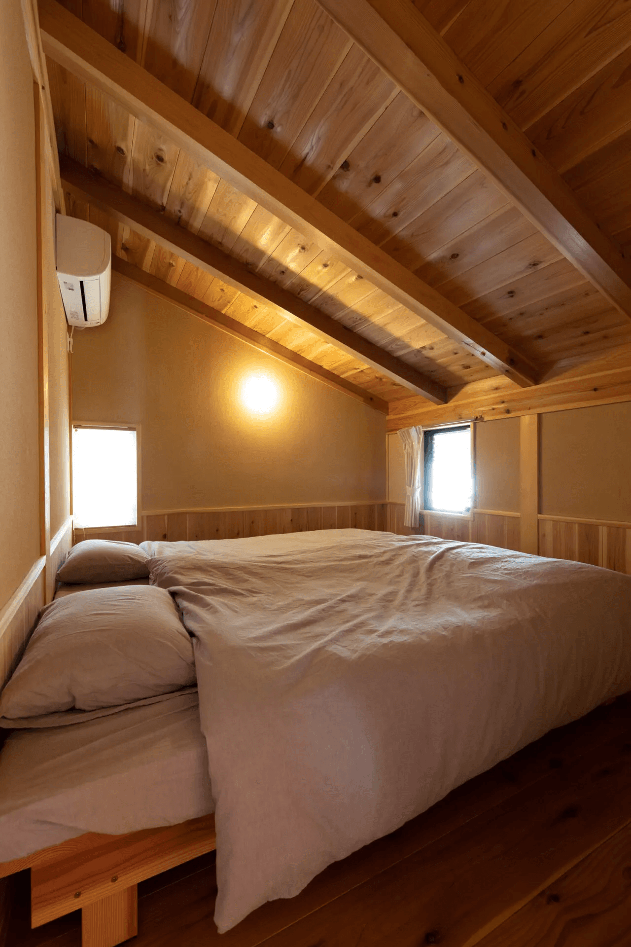 子供室と主寝室のベッドもご主人の作品。屋根裏がそのまま表しの天井になっています。