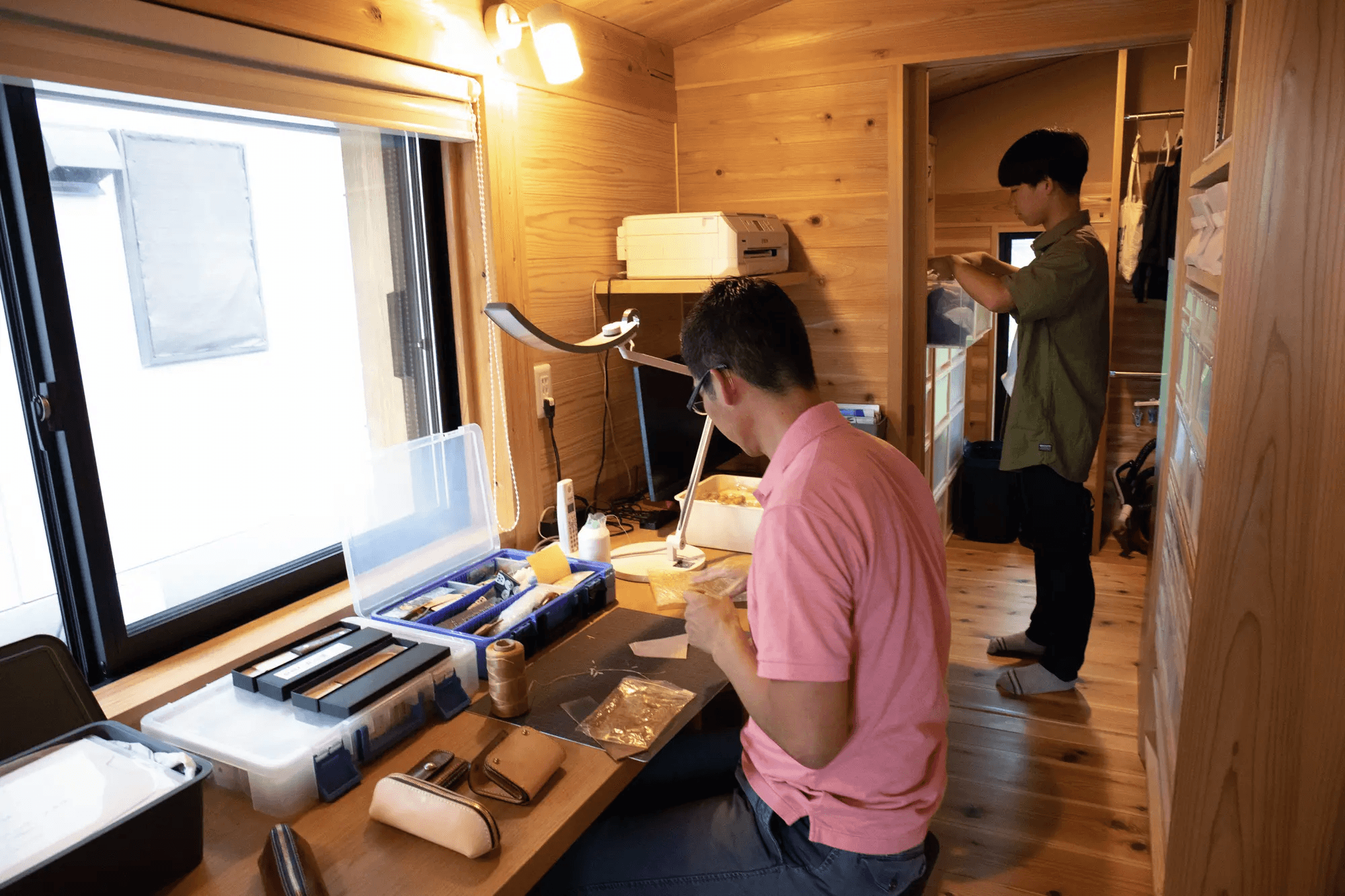 趣味のレザークラフトを親子で楽しまれています。奥のクローゼットの一角にも収納をたっぷりと設けました。