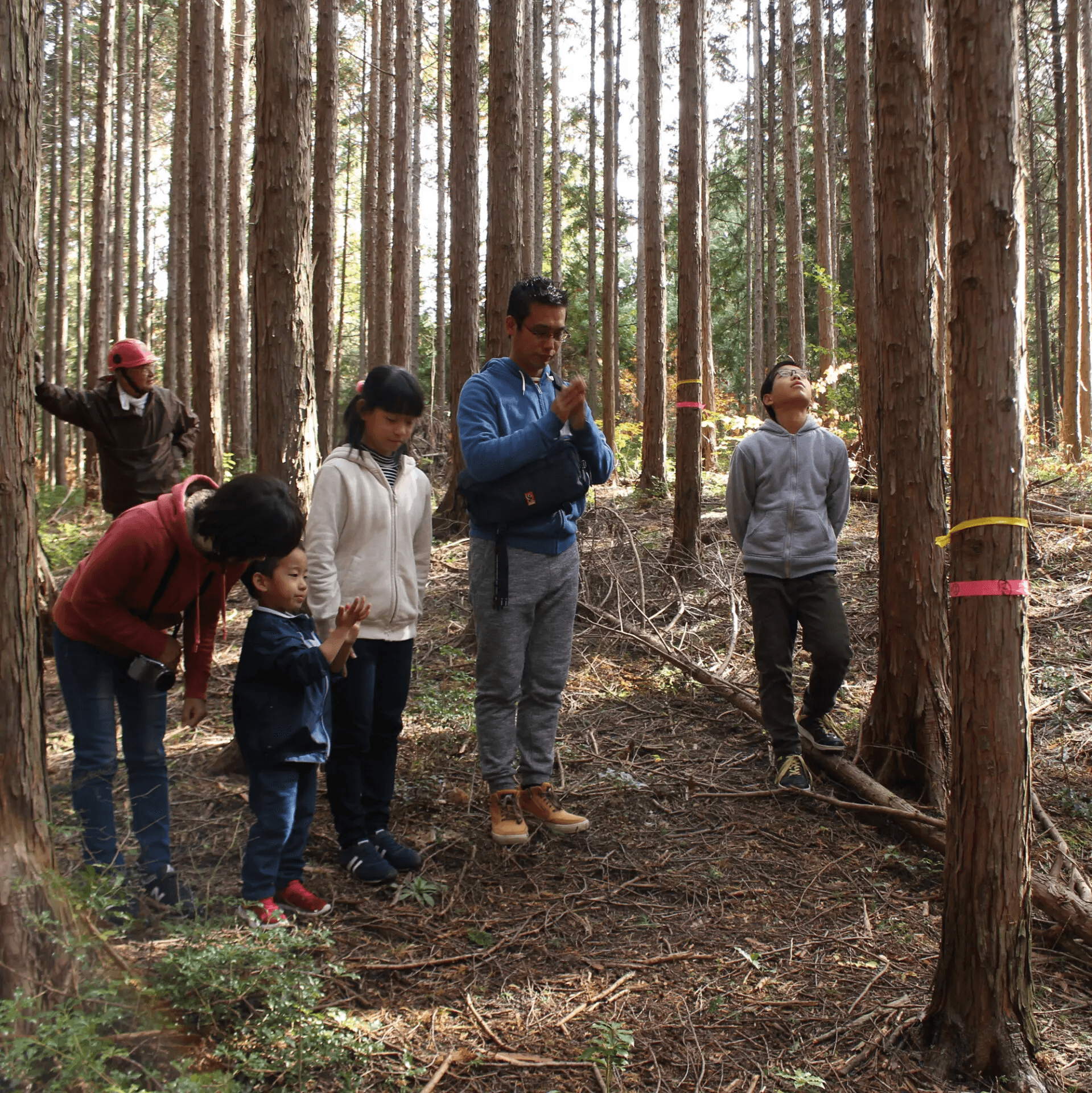 プランが決まり、住まい手ご家族と一緒に八百津の山へ木材の伐採に出かけました。伐り出したのは、梁に使う太い杉丸太と柱に使う檜の合計4本です。子供たちは幹に手を当てて、まるで木との愛称を確かめるようにして選んでいました。きっといつまでも、この時のことは覚えてくれているでしょうね!