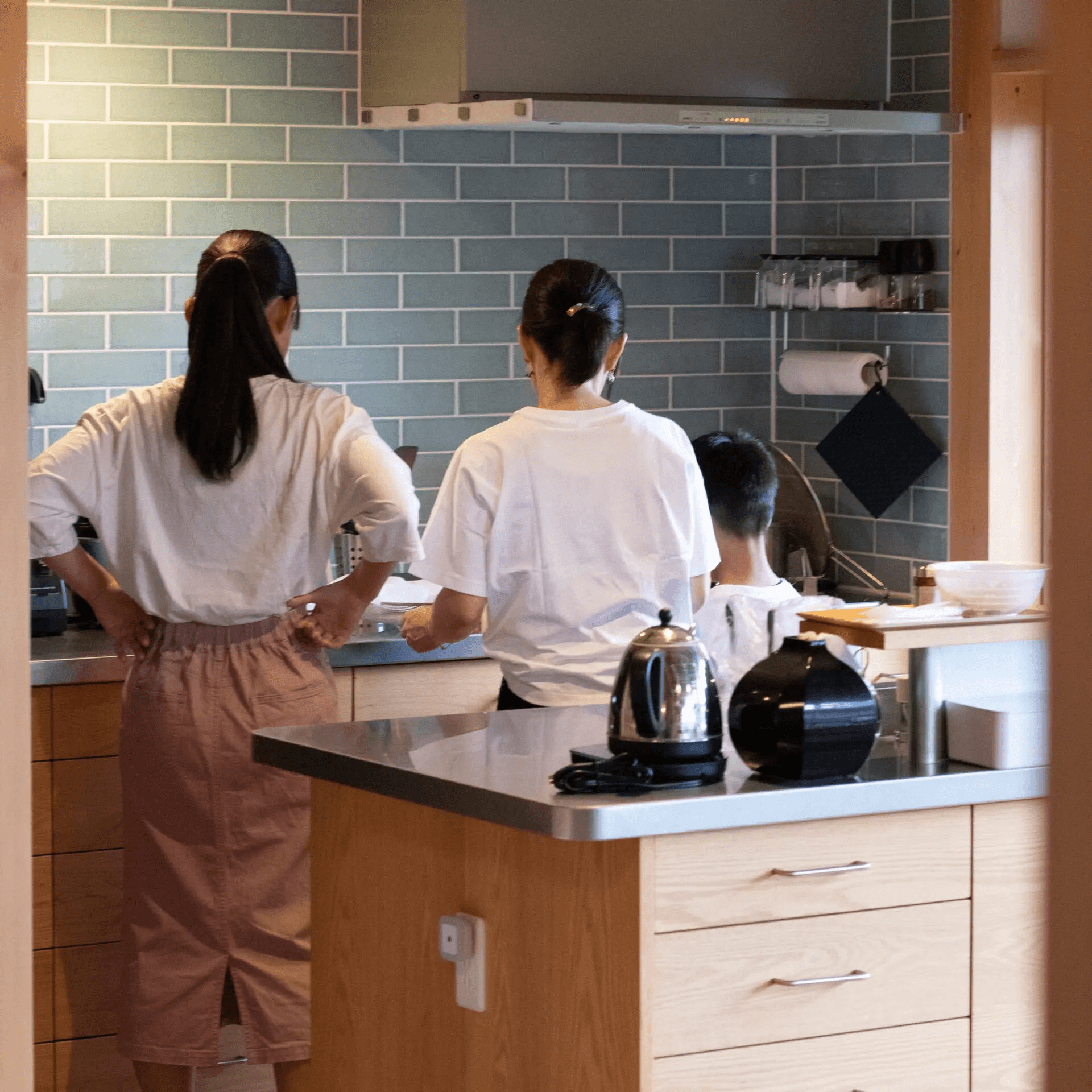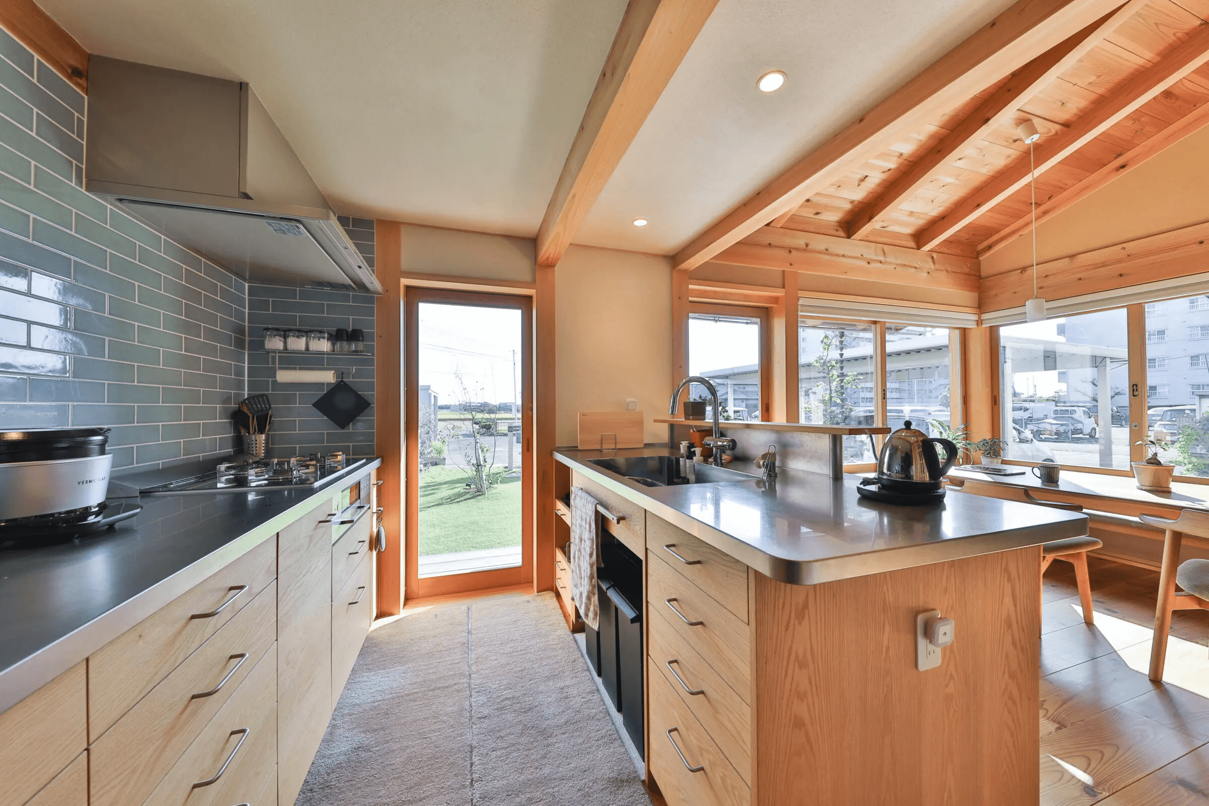 住まい手のご要望を詰め込んだオリジナルキッチン。親子で料理やお菓子作りを愉しめるようやや広めにしました。