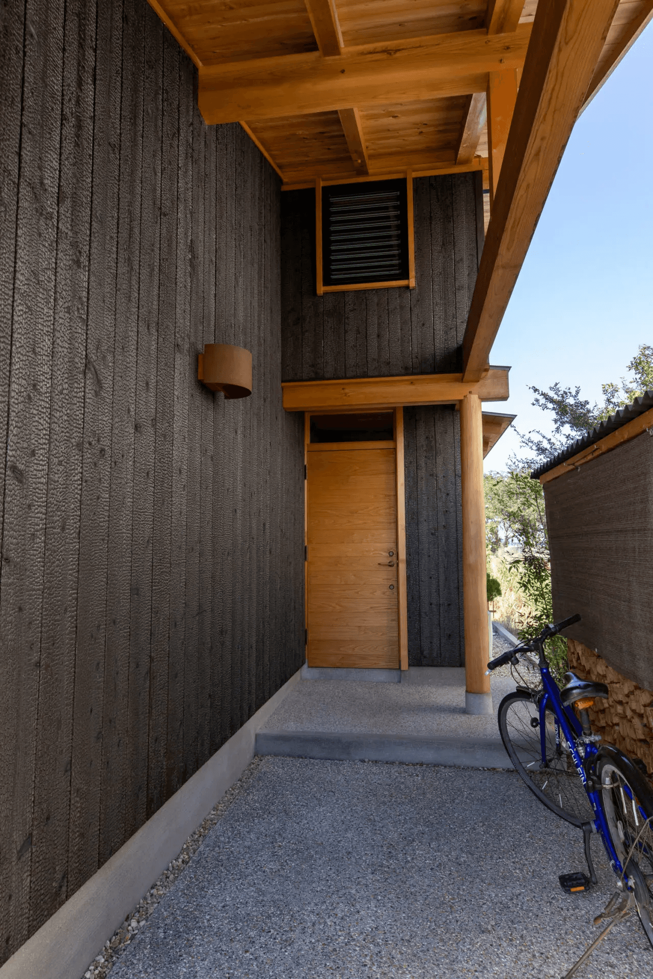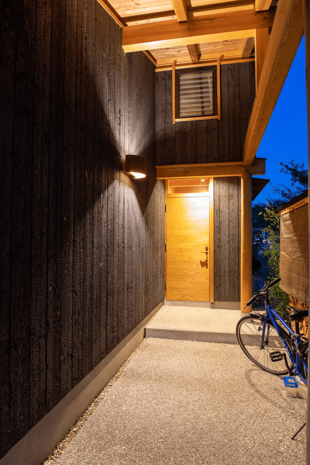 高い天井と足元を照らし、焼杉板の質感を浮き立たせてくてれいます。