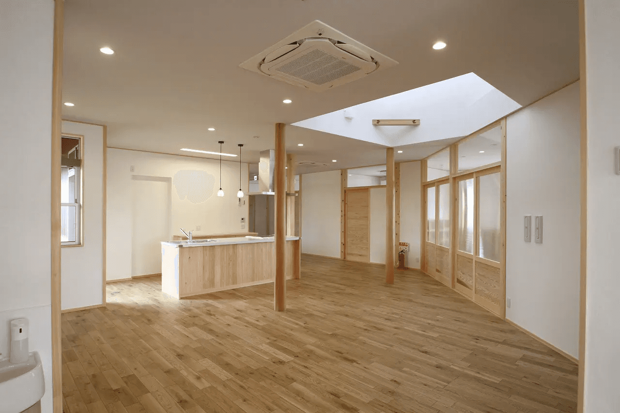 (玄関ホール) 吹き抜けから光が差し込み漆喰の壁に当たり、とても明るいです。 地域の交流の場としても活用されます。