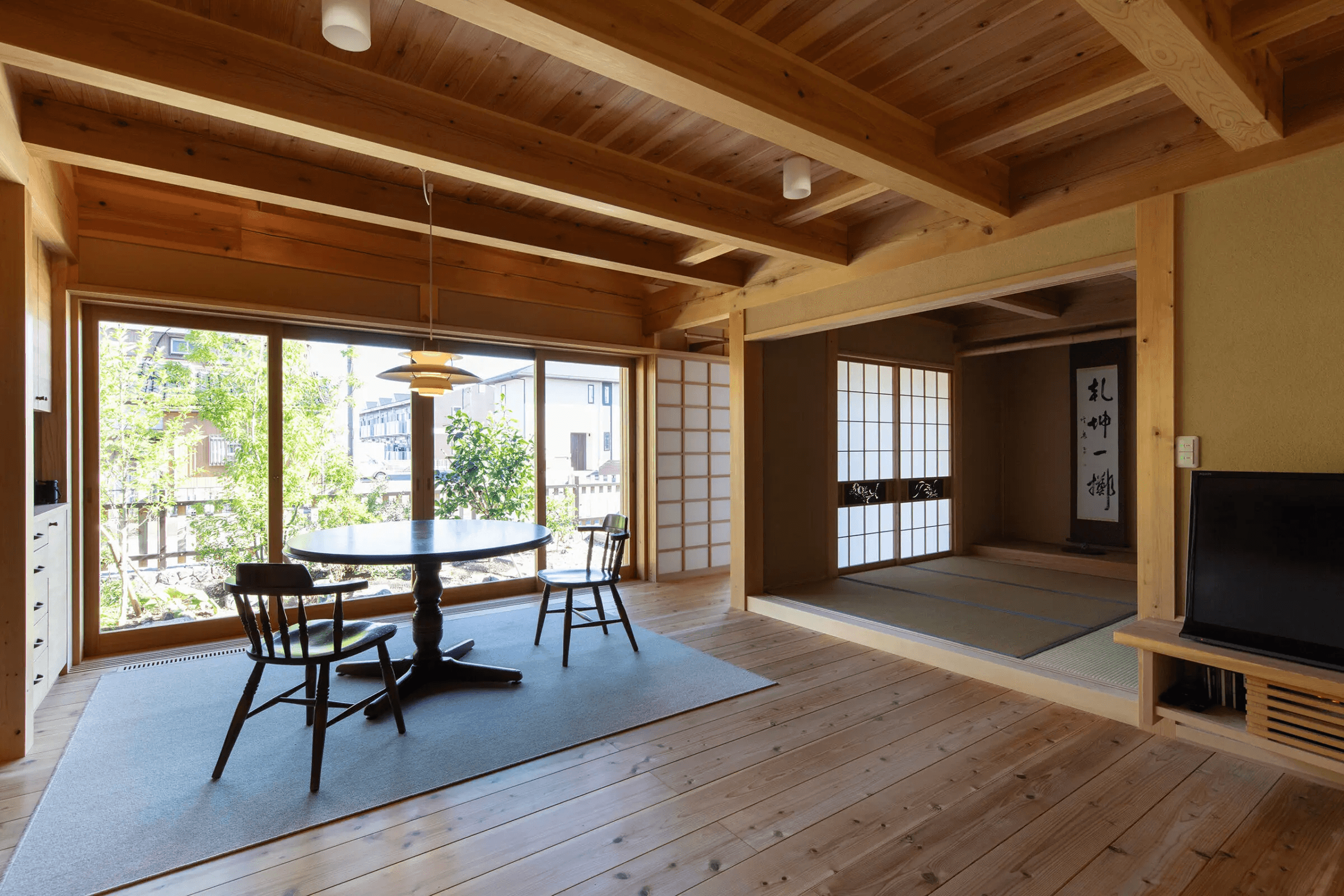 南の掃出し窓には、障子、ガラス戸、格子網戸、無双付の雨戸を全て引き込めるよう設えました。