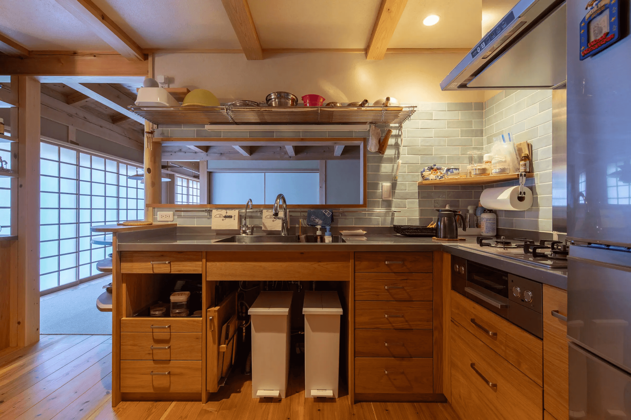 無垢の木でつくるオーダーキッチンには奥様のご要望が詰め込まれています。 上部のパイプ棚にはボウルや鍋など少し濡れていてもそのまま収納できます。