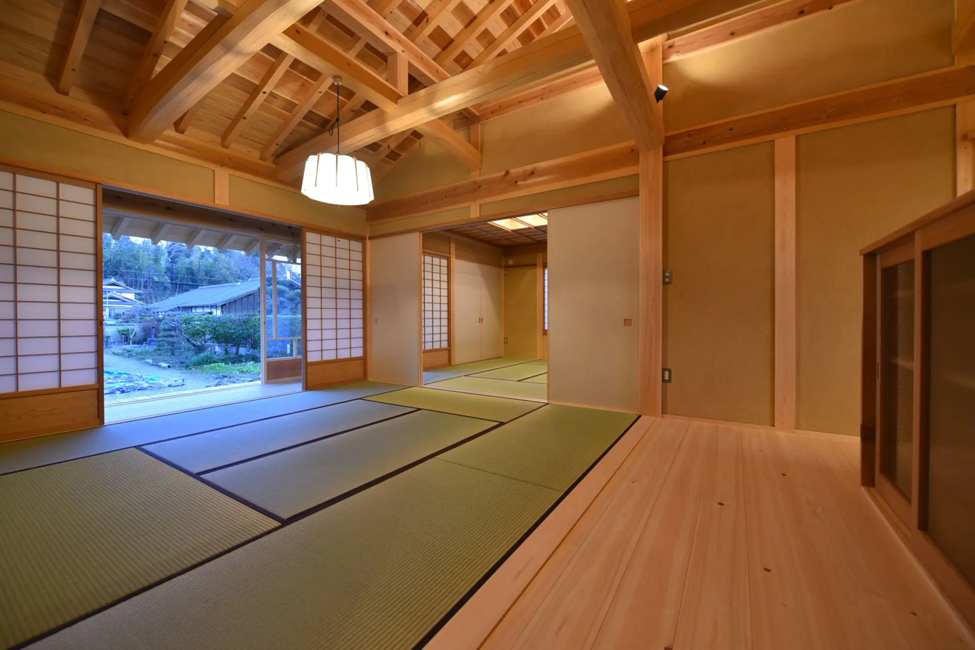 【床】桧板張り・藁畳敷き 【壁】土中塗り仕舞・杉板張り 【天井】杉野地板現し