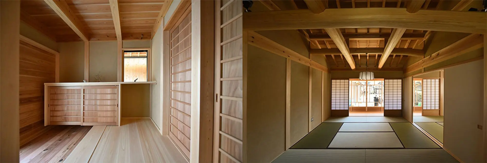 縁側や二間続きの和室・障子や多層の木製建具を採用し、季節や天気に合わせて採光や通風・土壁の蓄冷蓄熱を調整をする事で、自然のエネルギーを活用する住まい方です。