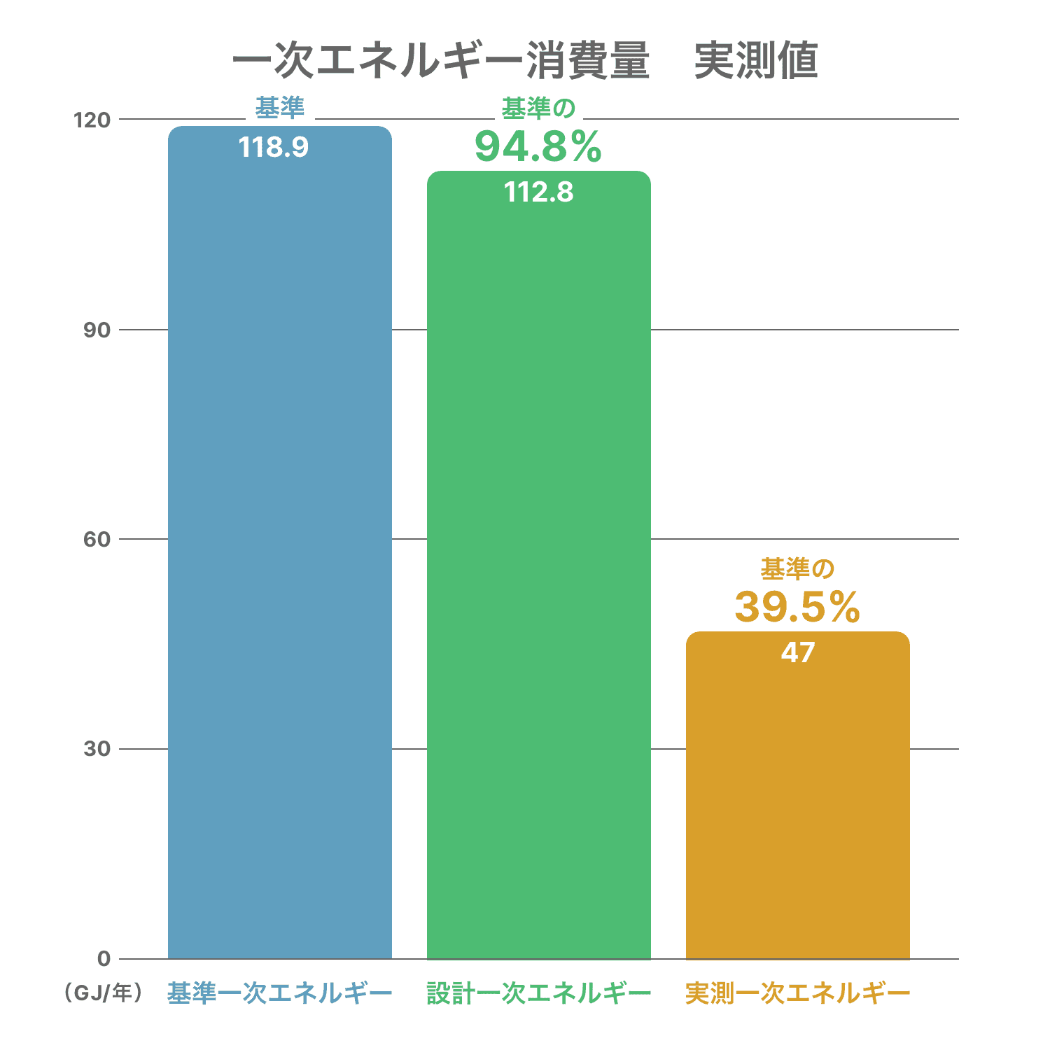 設計一次エネルギーは、基準一次エネルギーの94.8%程度であり、居住後の使用エネルギーは基準1次エネルギーの39.5%です。LED使用の安全性がまだ不確かなため主居室は白熱灯を使用していますが、気候風土適応住宅のさまざまな要素によって、消費エネルギーがおさえられていることが分かります。