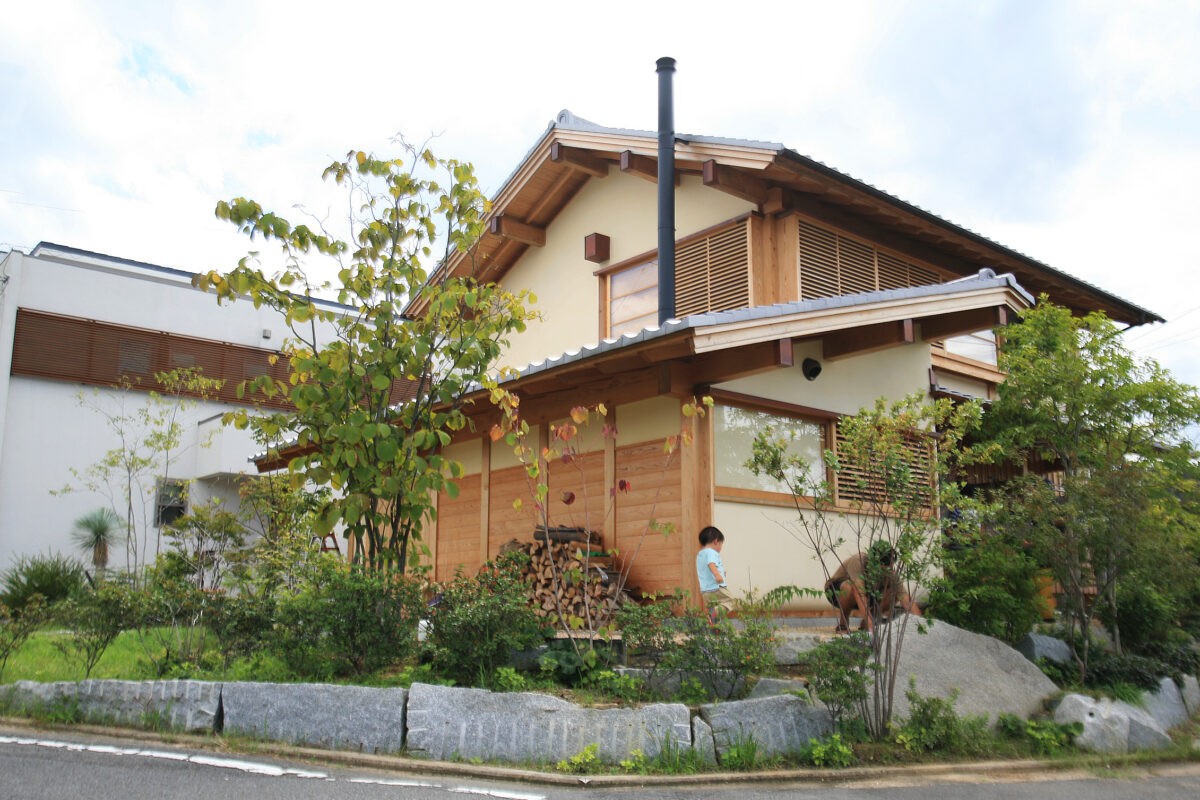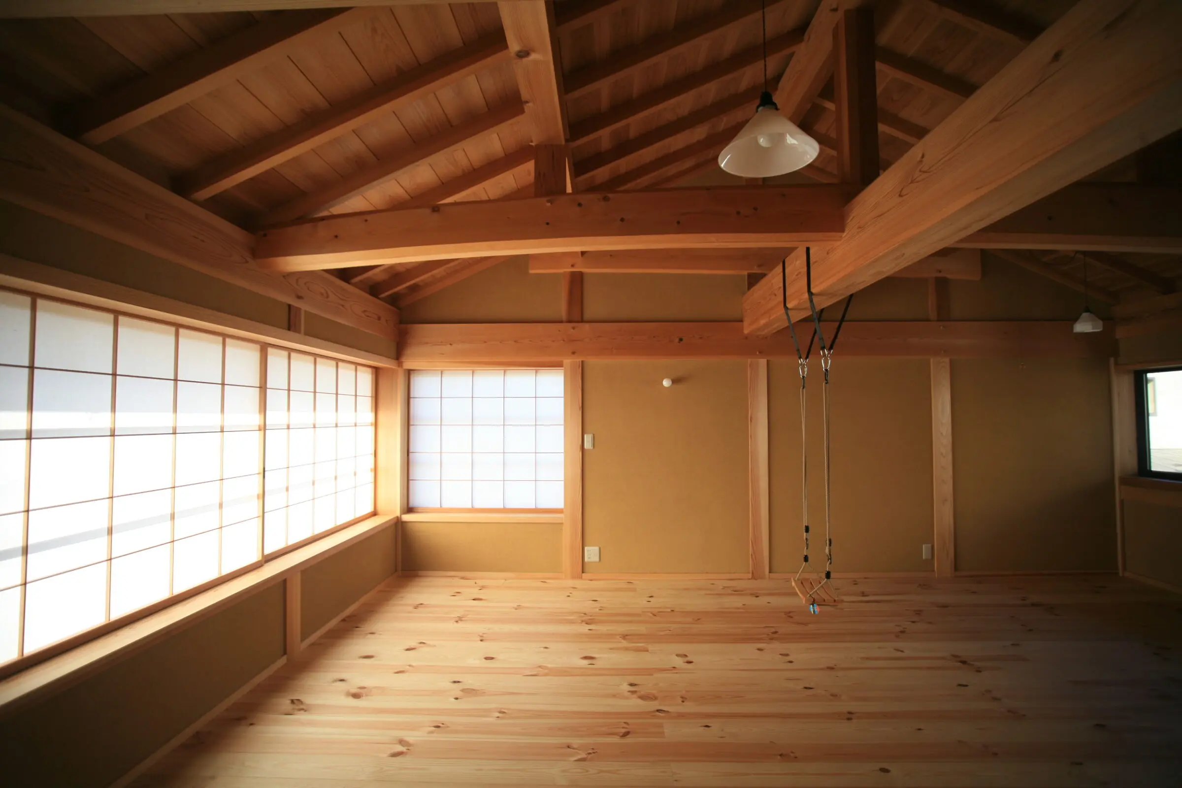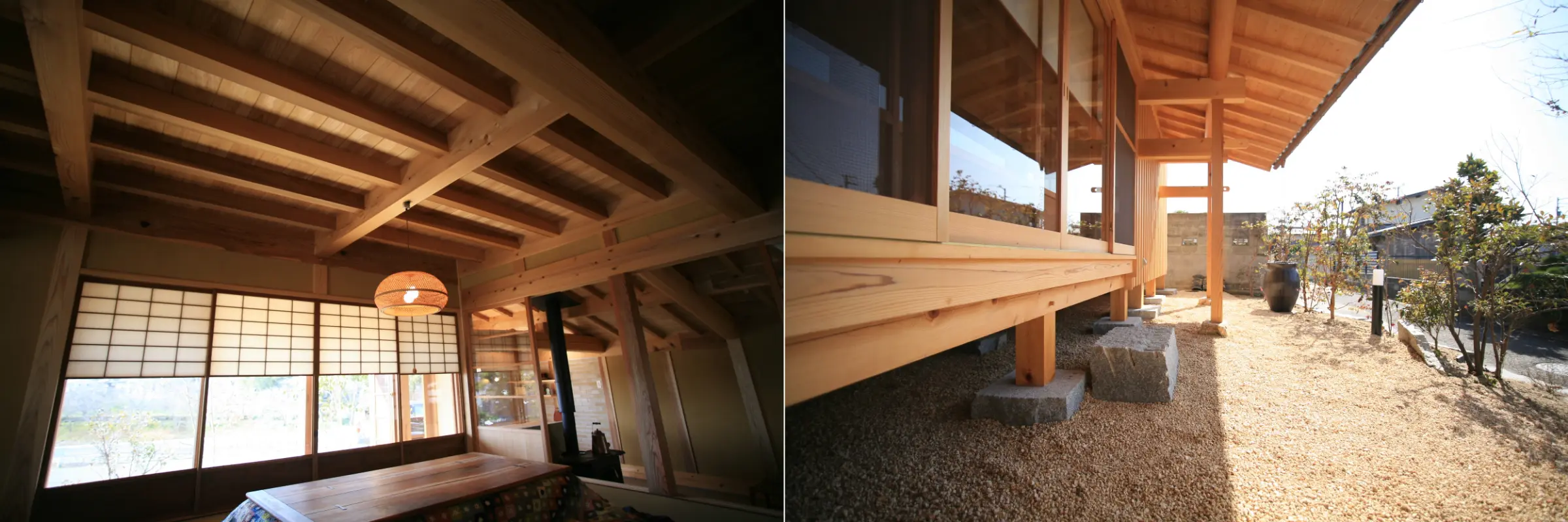 骨太の地域木材をつかった石場建て伝統構法であり、環境負荷のない自然乾燥による。手刻みによる伝統的な継手仕口を使用、和小屋や多重梁、差鴨居・足固による軸組である。維持管理しやすい真壁土壁。三和土土間、大壁づくりの荒壁漆喰など土に還る素材や工法を選択。