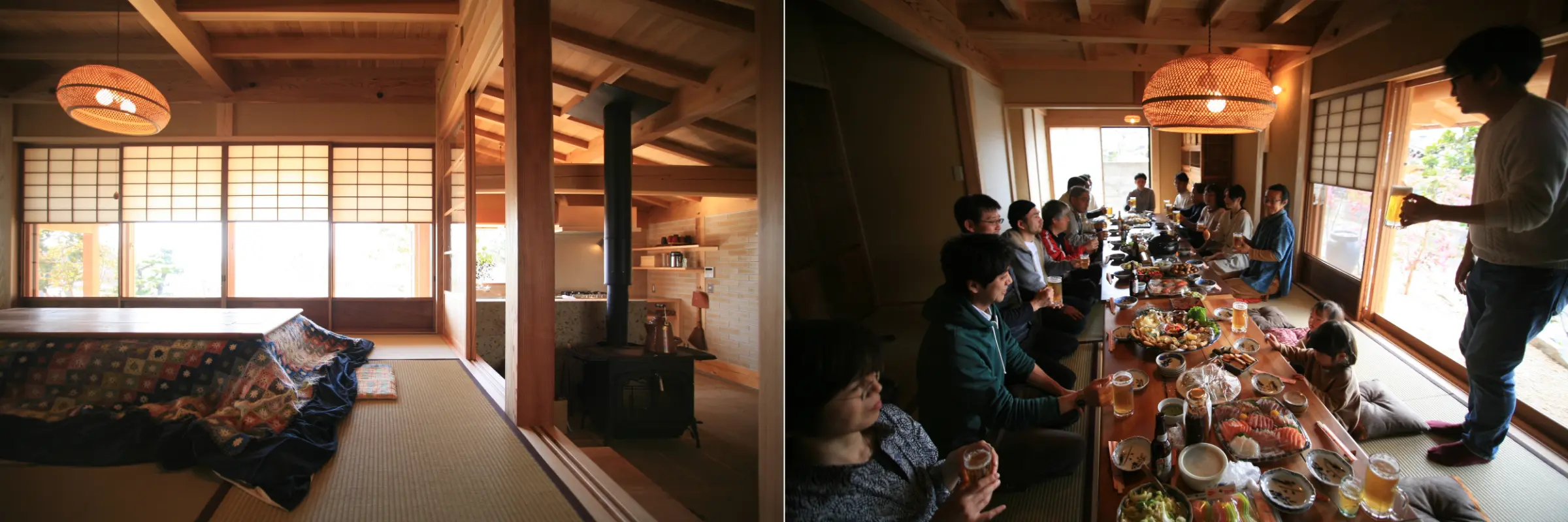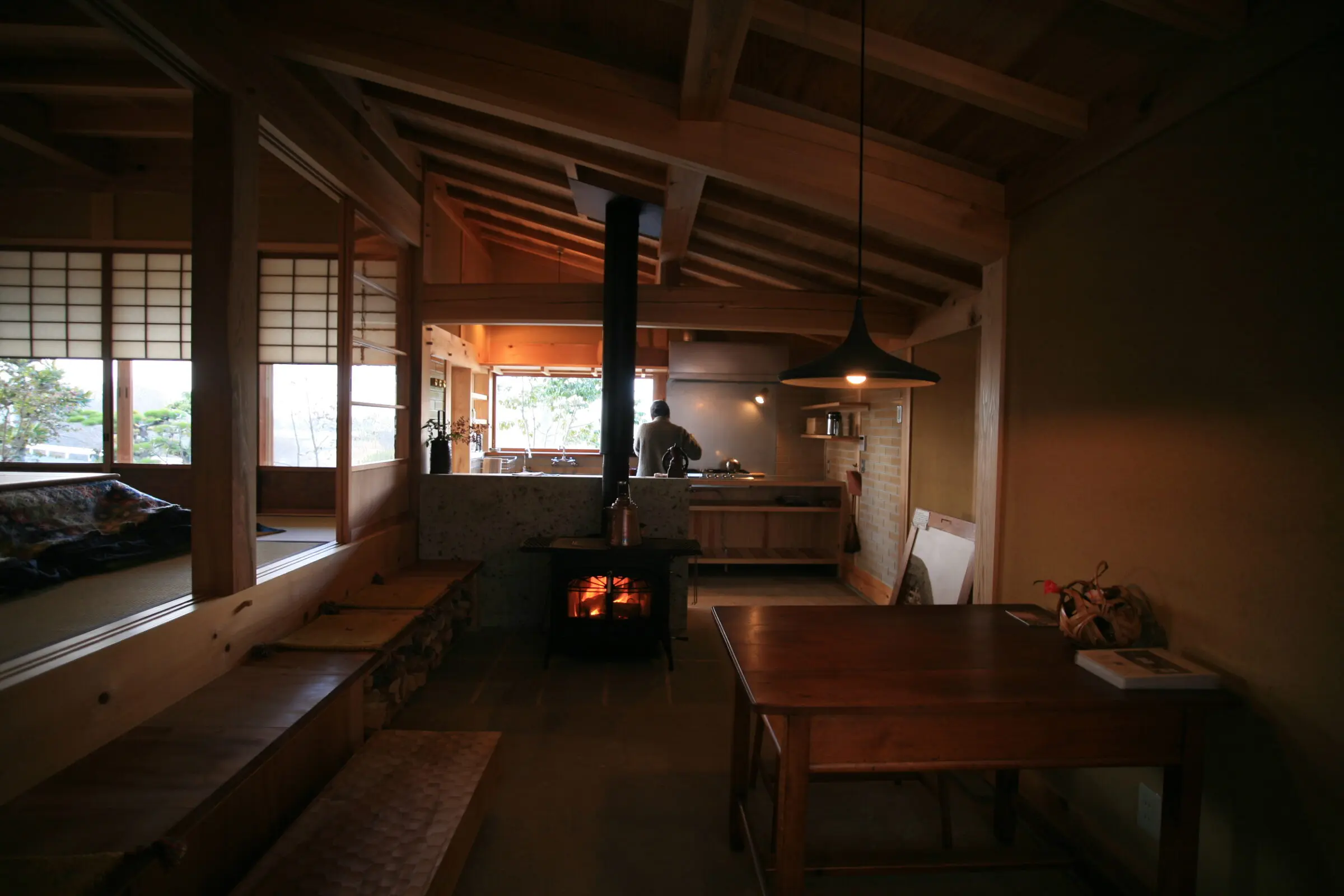 薪ストーブを配した三和土の土間は玄関であり台所、食卓、応接間として機能する。土壁が薪ストーブの熱を蓄熱し冬は暖かく、夏は北に位置するため土間は低温である。内部建具の仕切り方で空間や温熱的に住人の住まい方に合わせてフレキシブルに変化。季節に応じて空間を縮小化させエネルギーを無駄にせず小さく暮らす和の暮らし。土間から続く二間続きの畳の間には堀ゴタツがあり床座の暮らし。続き間は大勢のお客にも対応。続き間の畳の間が快適すぎて家族全員ここで寝る。個室の寝室を使っていないのは予定外だが、これがフレキシブルな日本の家の良さ。