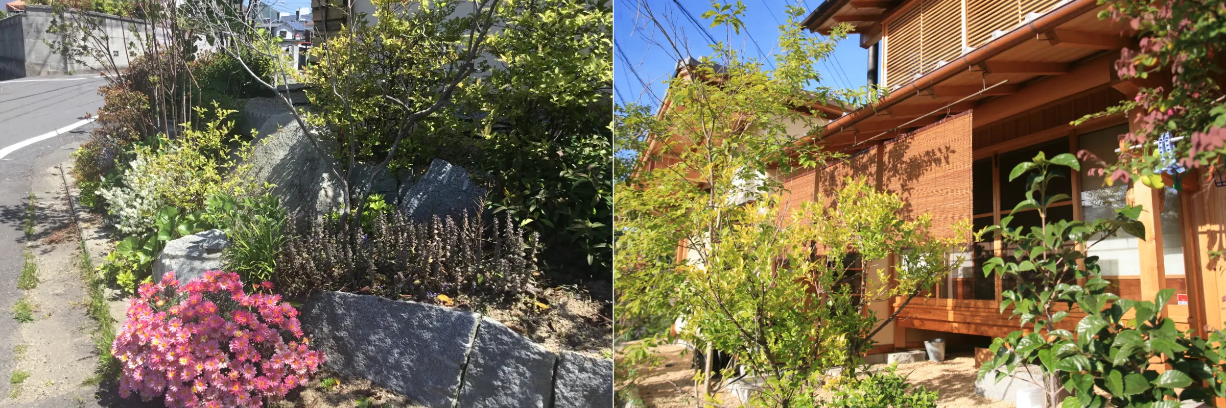 道路境界ギリギリまで緑化され、地域の憩いの景観となるとともに小さな生物の生育区域となっている。