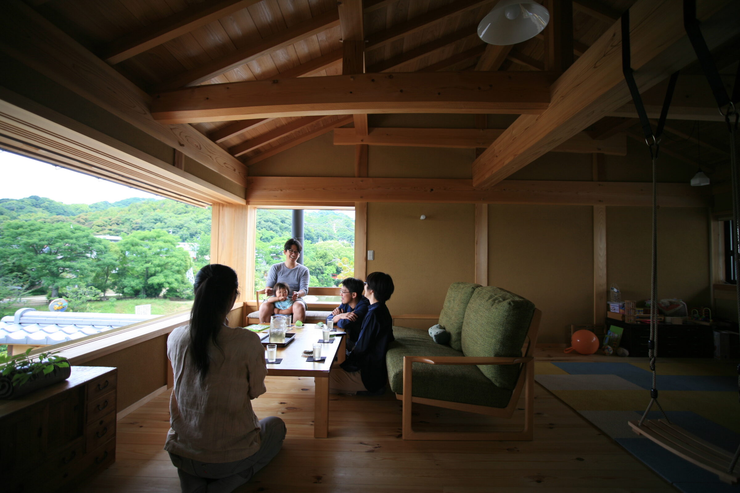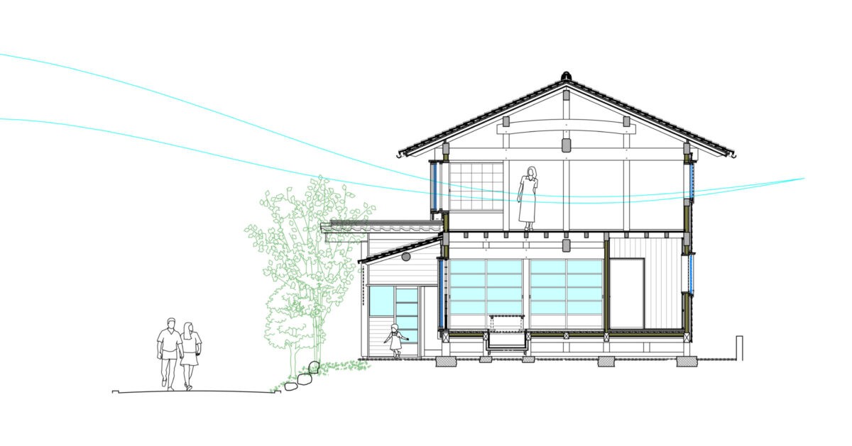 これから子育てを迎えるというご夫婦は昔ながらの土間と畳のある家を望まれ、河川敷の緑地公園に対して大きく開いた家は、地元の季節風である西風を取り込むつくりを主として重んじ、季節と共に快適にくらす先人たちの暮らしの知恵・伝統的な家造りの知恵を見習うこととしました。