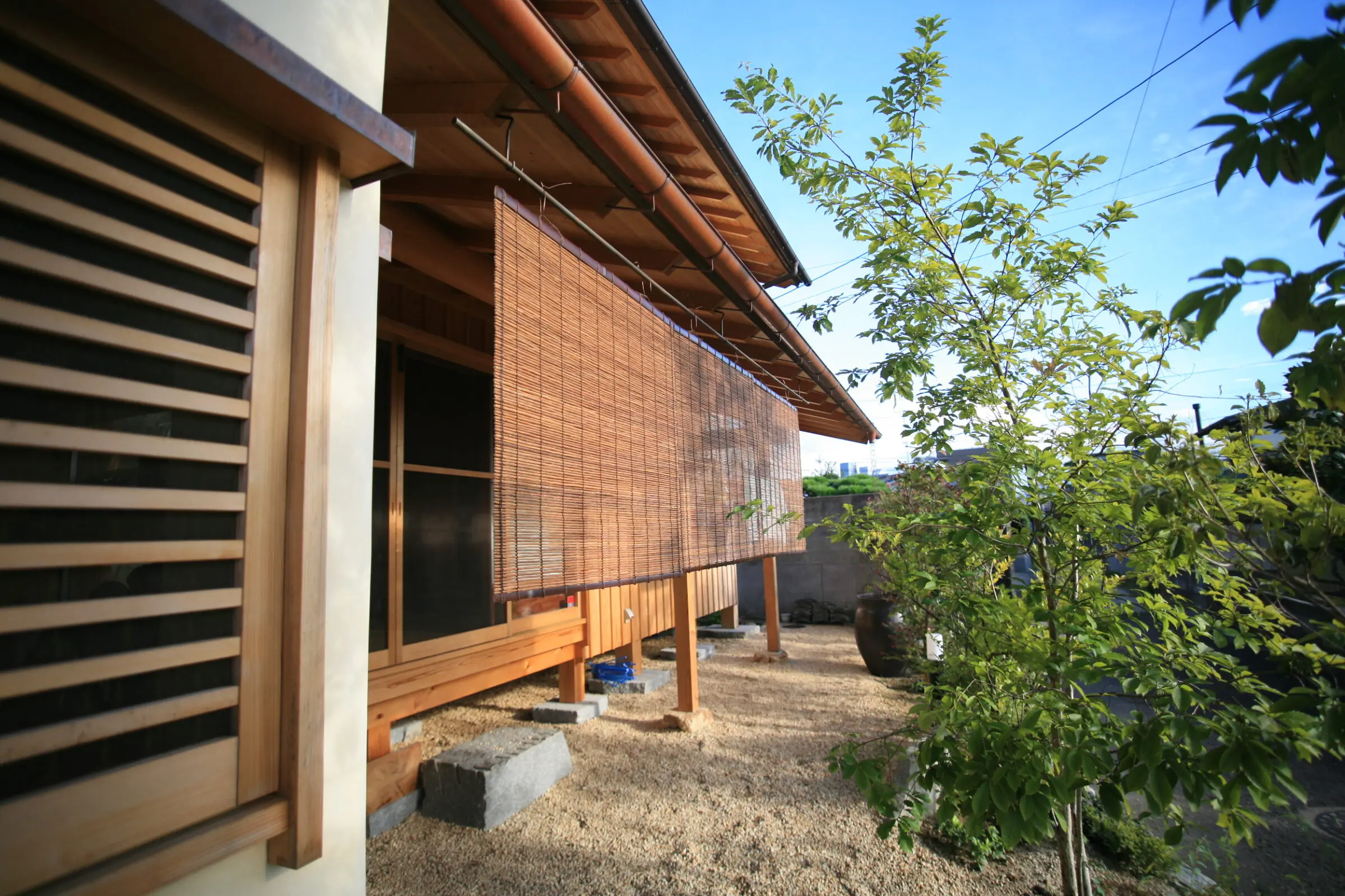 深い軒庇や窓から距離をとってスダレを垂らすなど日射を有効的に遮り、また土の空間を残し夏場の照り返し抑制と緑陰を通る風を室内に取り込む。 深い軒庇や窓から距離をとってスダレを垂らすなど日射を有効的に遮り、また土の空間を残し夏場の照り返し抑制と緑陰を通る風を室内に取り込む。