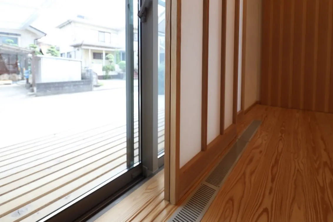 内障子は、ほとんどの部屋に設置されており調湿と気密の効果で夏と冬の温熱環境に寄与している。その他雨戸、木格子は台風被害を避けるための安心感につながる。床は、27㎜厚の杉板で低温乾燥で含水率を一度8%まで落として、床下暖房に使用出来るようにしている。調湿性があり梅雨時のジメジメ感がないし熱伝導率が低いので冷たさを感じない。床に見えているグリルは床下エアコン用である。