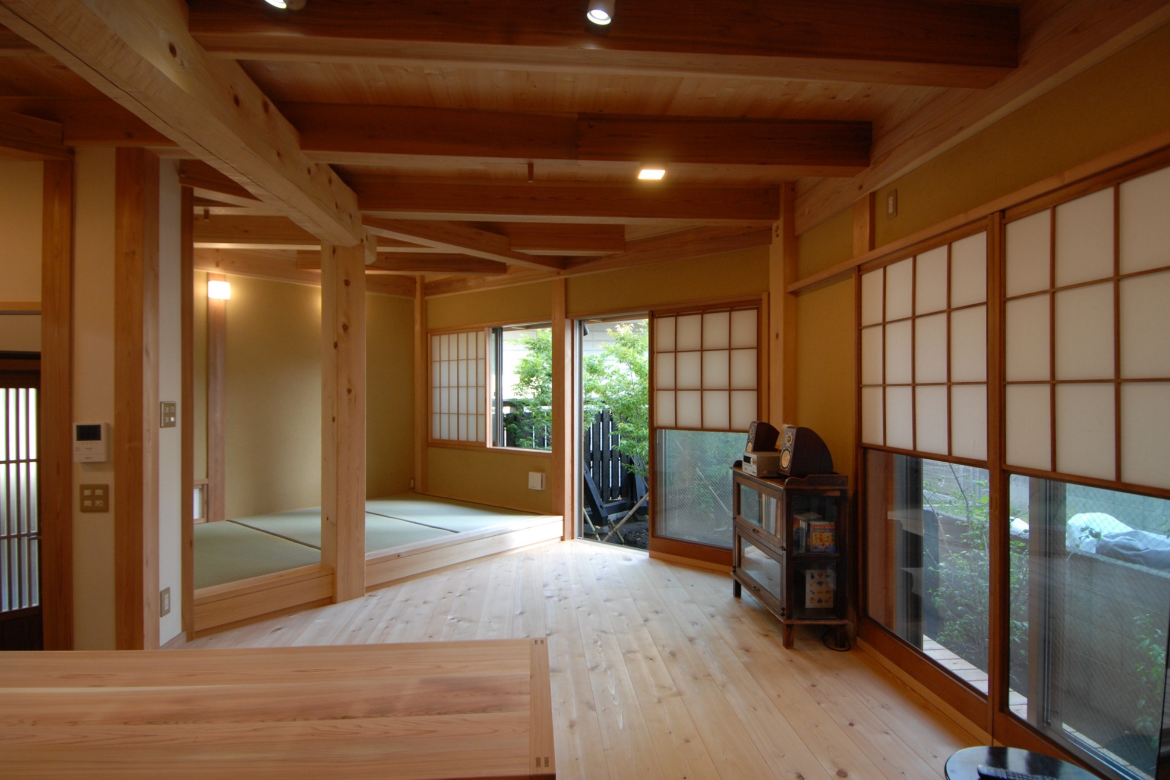 林産県(大分・熊本)に近く、日田の原木市場も近いので、近郊には多くの製材所がある(30分圏内)。地域の林業と製材所をなくさない、という方向性を持っている。天井野地板(厚み30㎜)は瓦屋根の断熱材、屋根の通気層、日射遮蔽効果等で表面温度は猛暑日でも30度くらいである。
