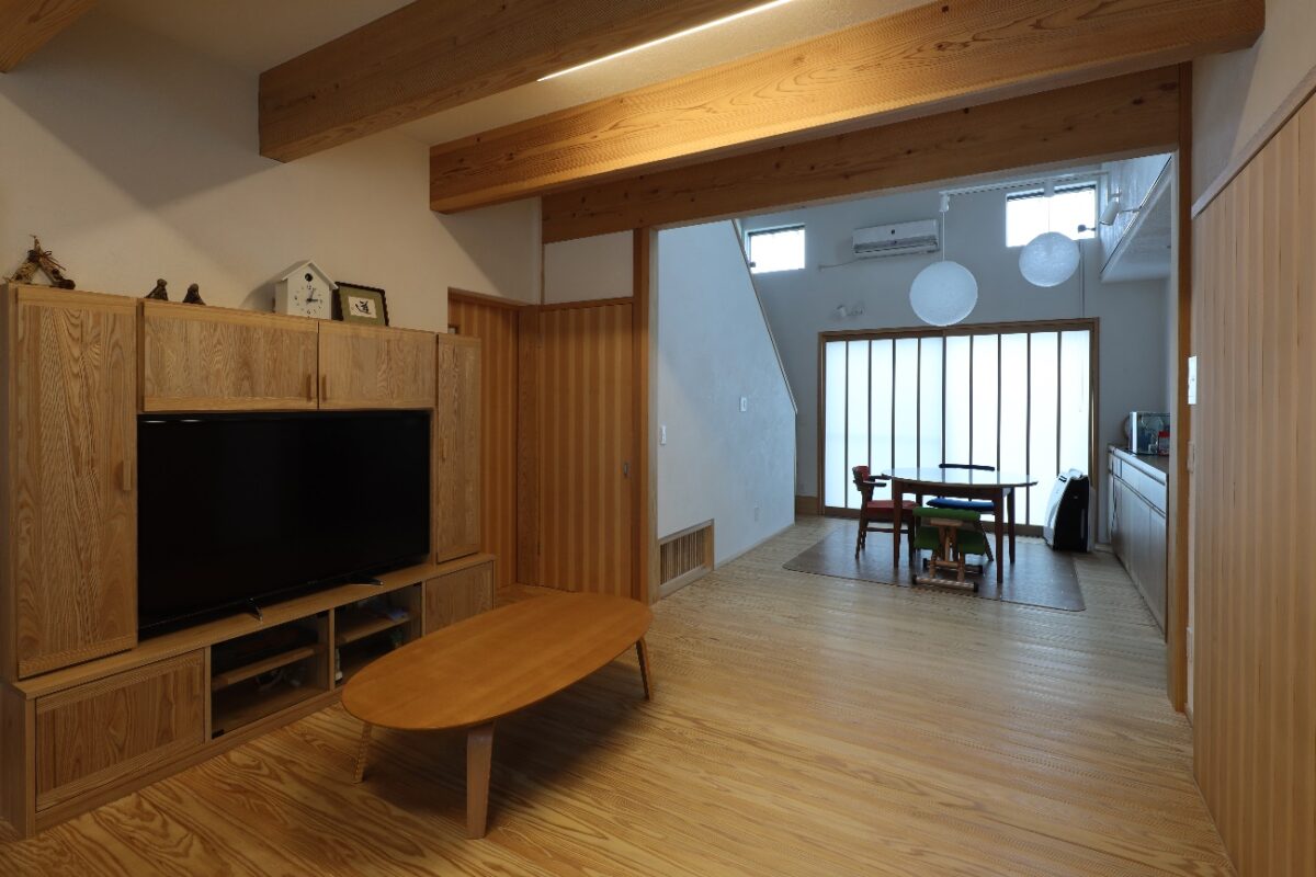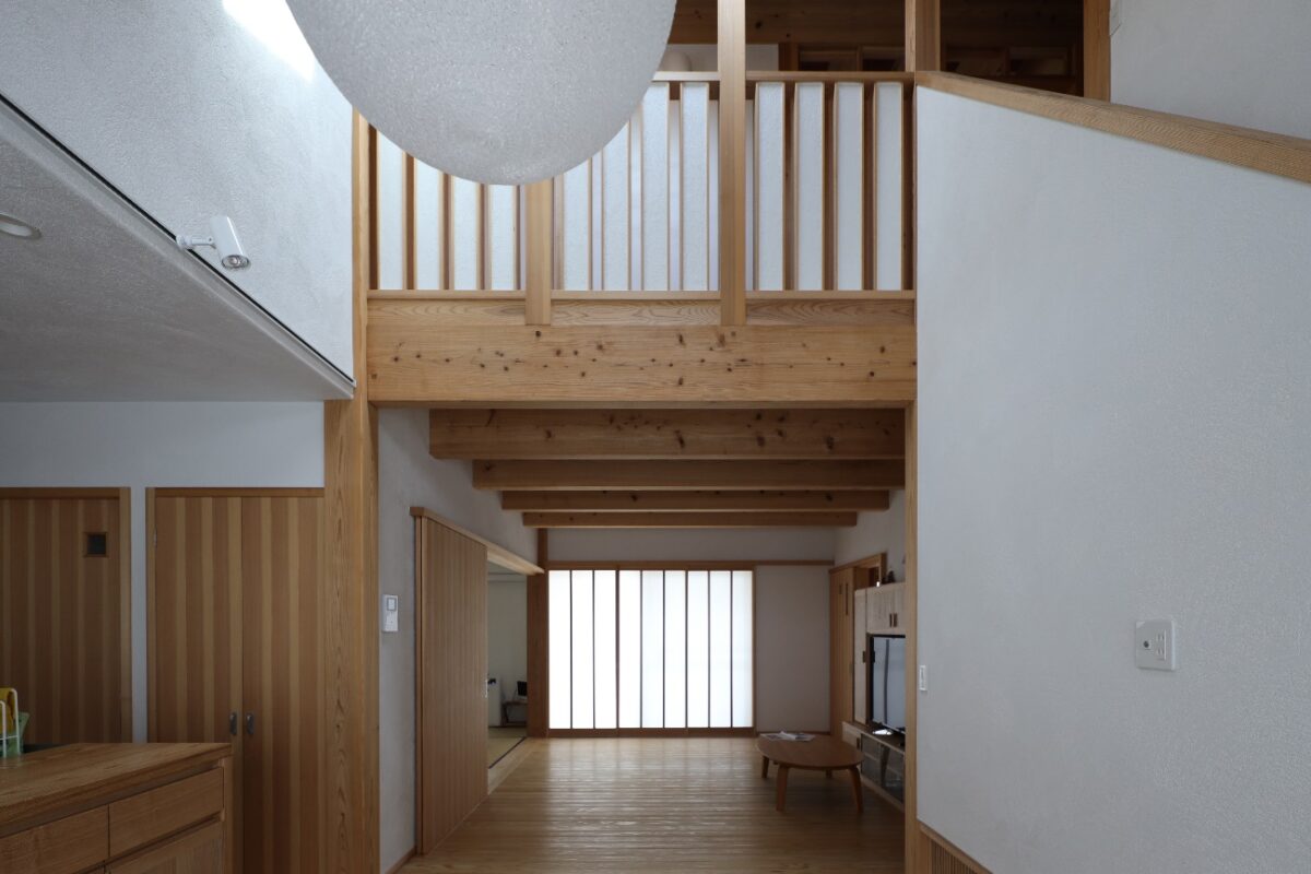 引戸による空間の開放的な繋がりは、季節や天候にも対応しやすく、現代的な暮らしに自由度を与えるものとなる。床下エアコンと吹抜けによる一体的な空間構成は設備エネルギーの省力化に貢献するものである。