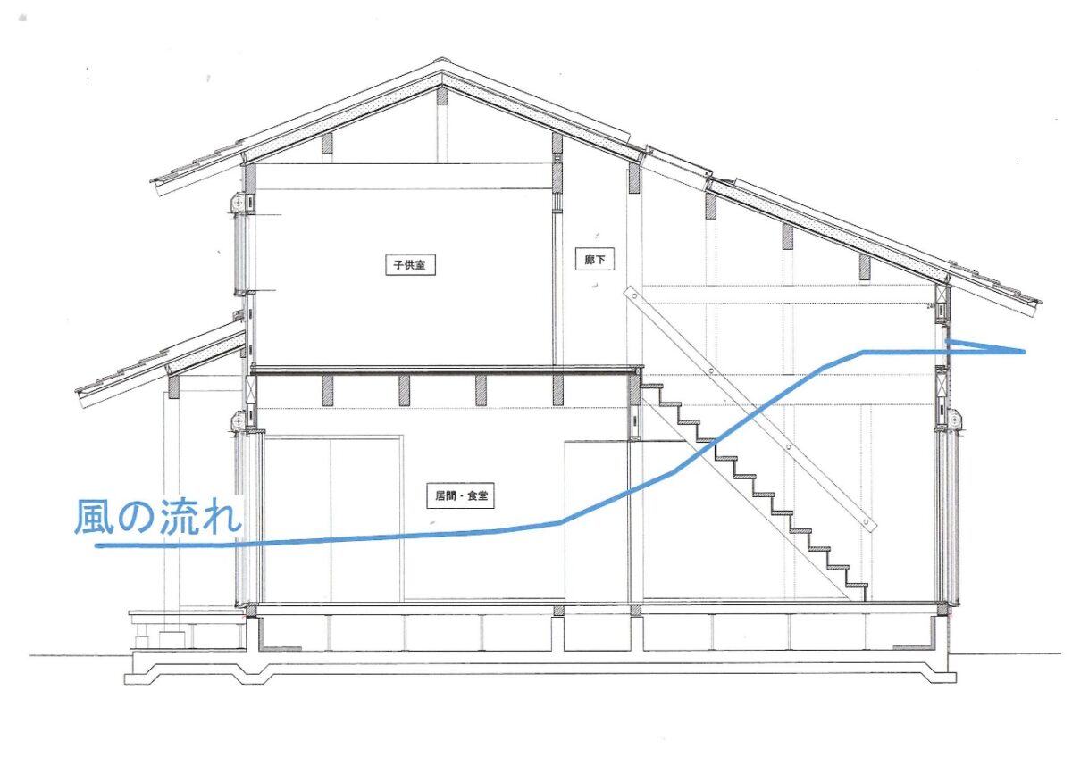 土地面積に制約がある敷地において、一体的な居間・食堂・台所、引戸の建具でつながる和室、吹抜けによって開放的で広がりのある空間構成とし、上下方向の風の流れに配慮している。